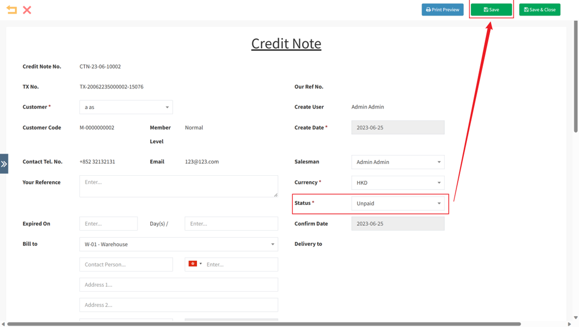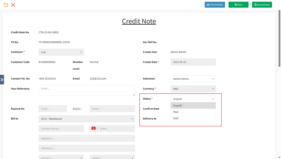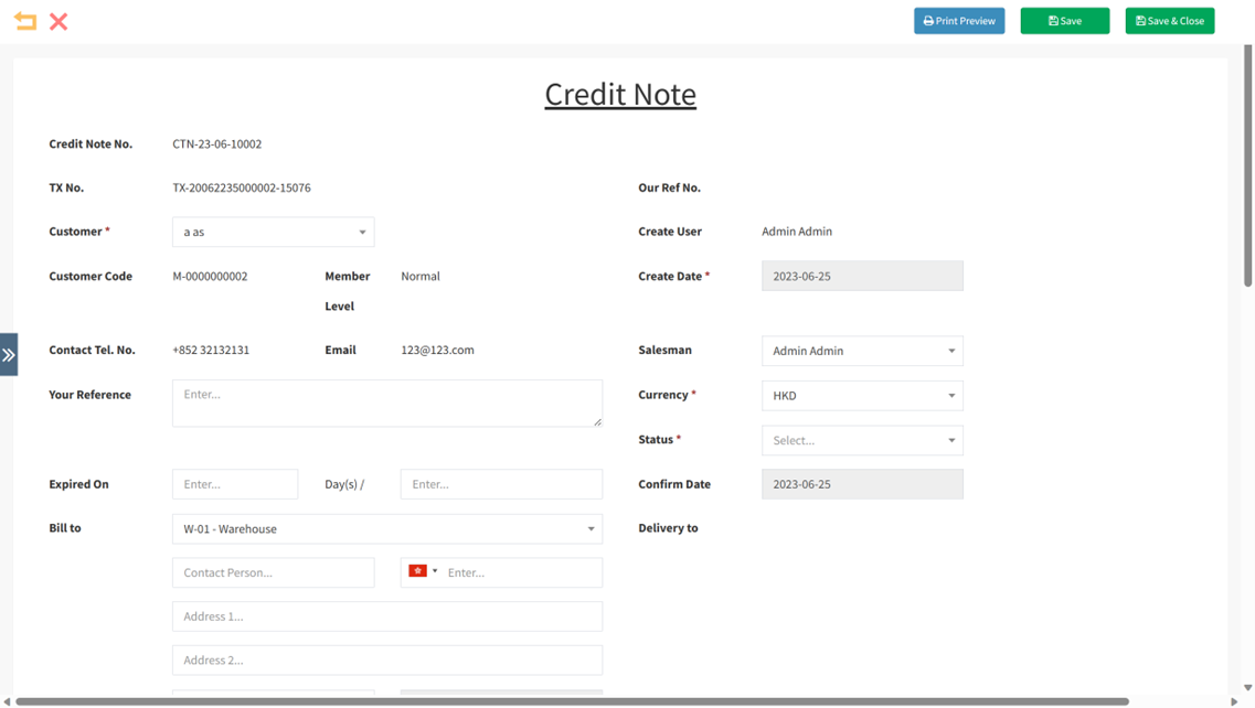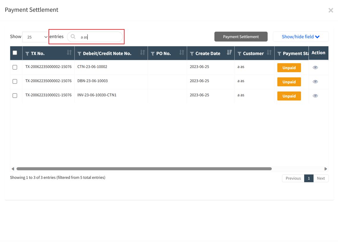 Example: To search for customers, enter“one two three”, you can search for all Debit Notes and Credit Notes of one two three merchants.