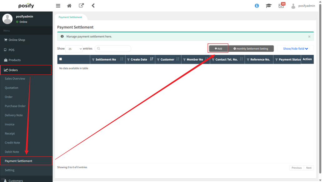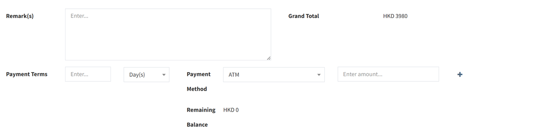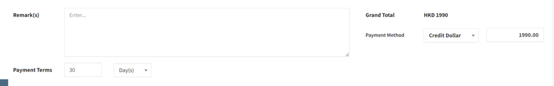 You can see the settlement total at the bottom, and you can set the payment terms and payment methods.