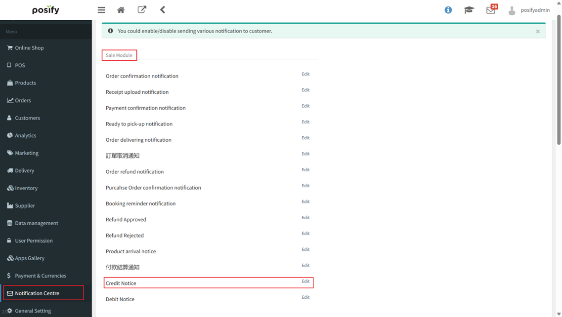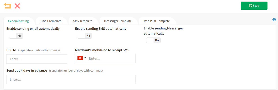 Enter the edit page, click the tab basic setting . Like the reminder notification of Debit Note, you can choose Enable automatic email notification, automatic SMS notification, automatic Messenger notification . Set up as shown in the figure below, and the merchant will be notified by email.