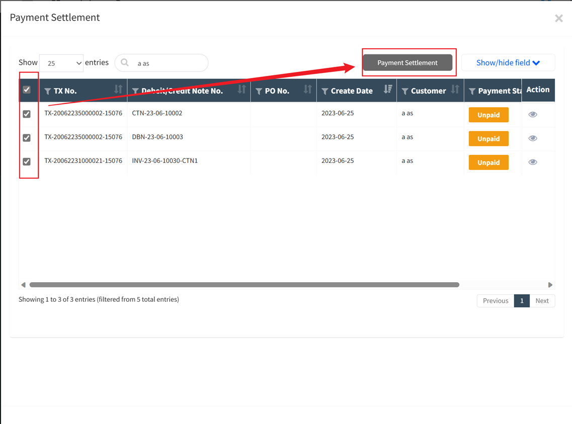 Payment settlement is to calculate multiple Debit Notes and Credit Notes together.