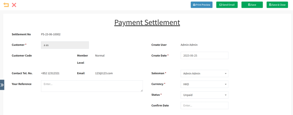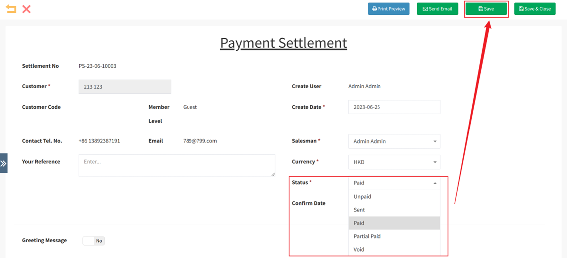 After the party in arrears completes the payment, change the status to paid for , and then click [Save] in the upper right corner to complete the payment settlement.