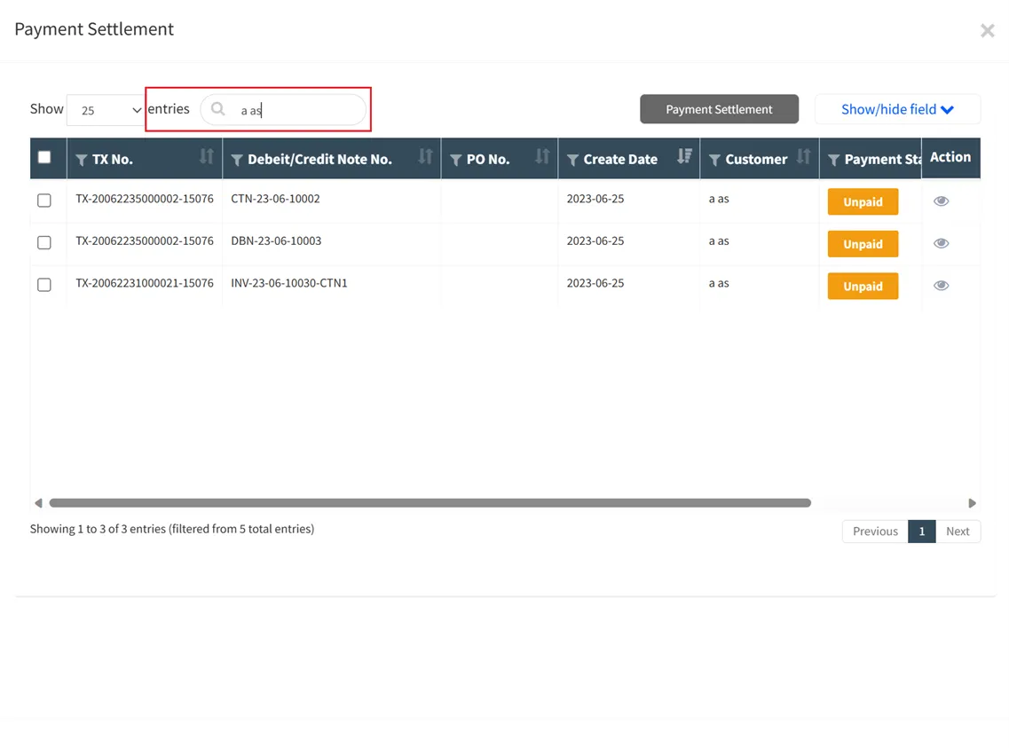 Example: To search for customers, enter“one two three”, you can search for all Debit Notes and Credit Notes of one two three merchants.