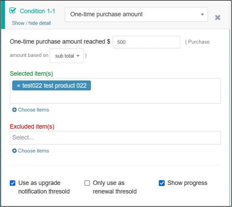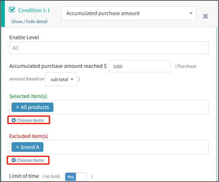 If you select a sub total, you need to select [Select Item(s)] and [Exclude Item(s)] to delineate the scope of the calculated products. When calculating the accumulated amount, only the purchase amount of the products in the scope is calculated.