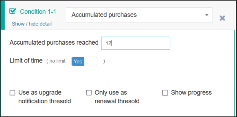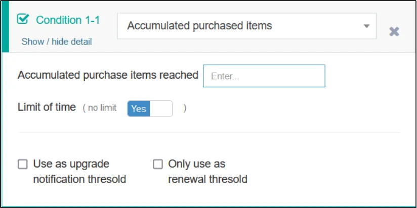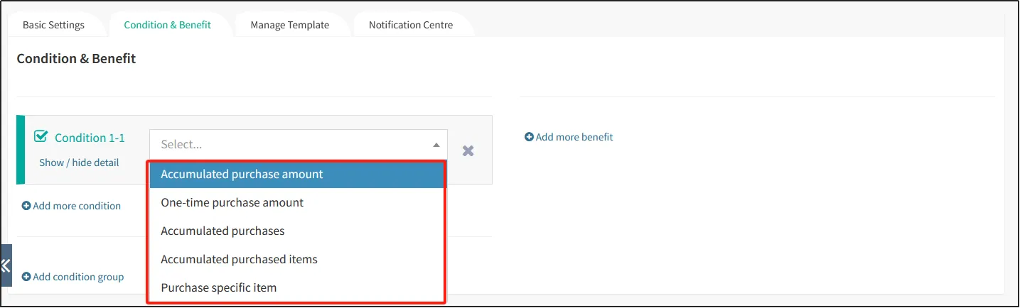 Click the drop-down list of conditions to select the type of condition. There are five types, namely: Accumulated purchase amount, One-time purchase amount, Accumulated purchases, Accumulated purchased items and Purchase specific item.