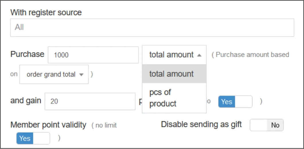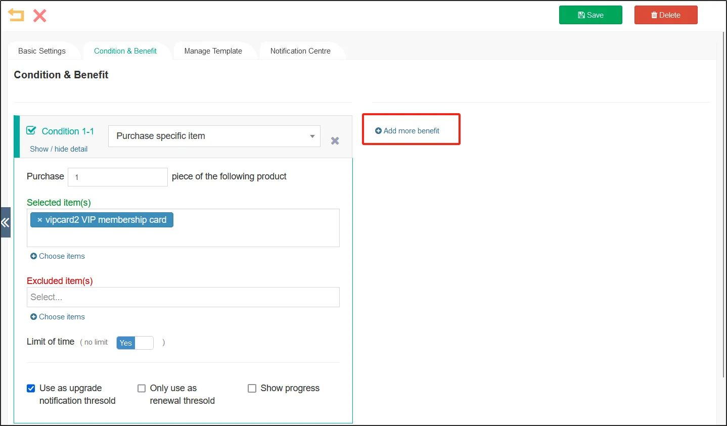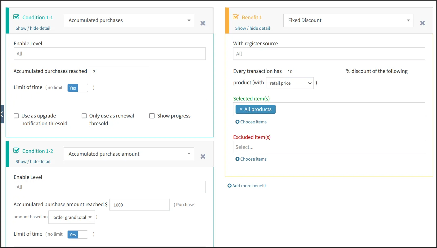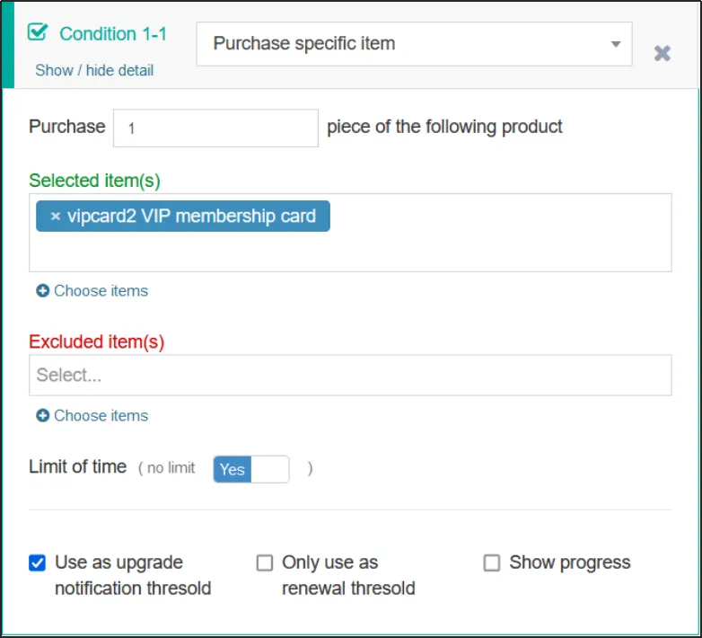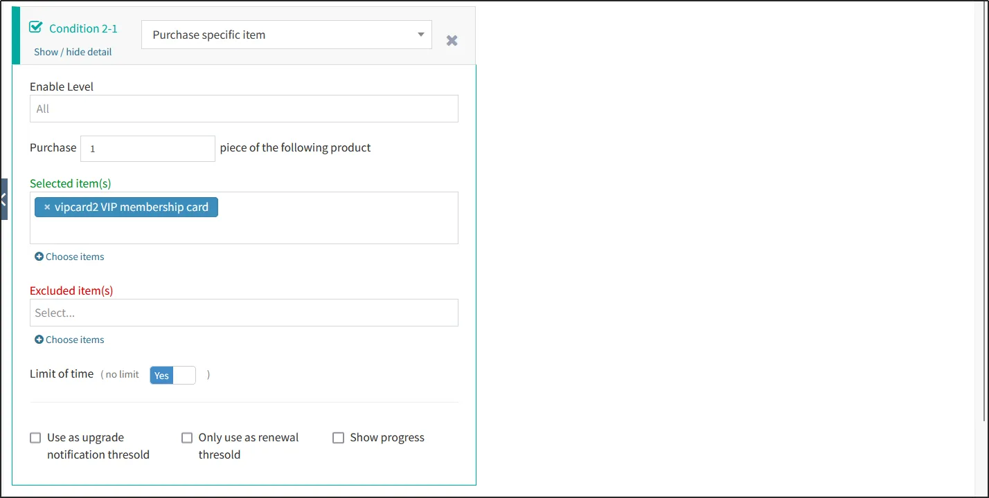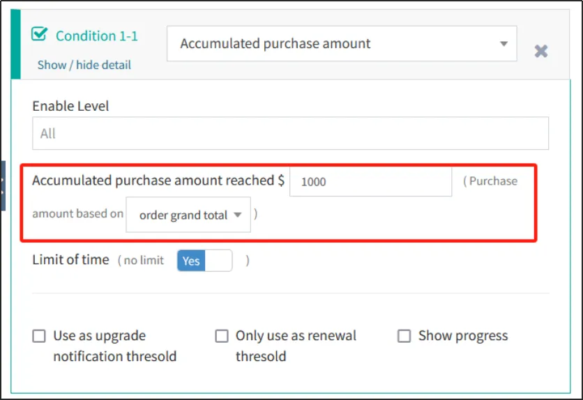 Similarly, you need to set how the purchase amount is calculated and whether it will be used as a condition for upgrading/renewing your membership.