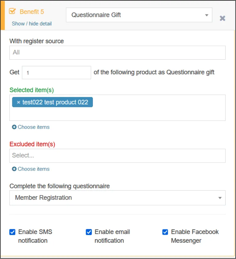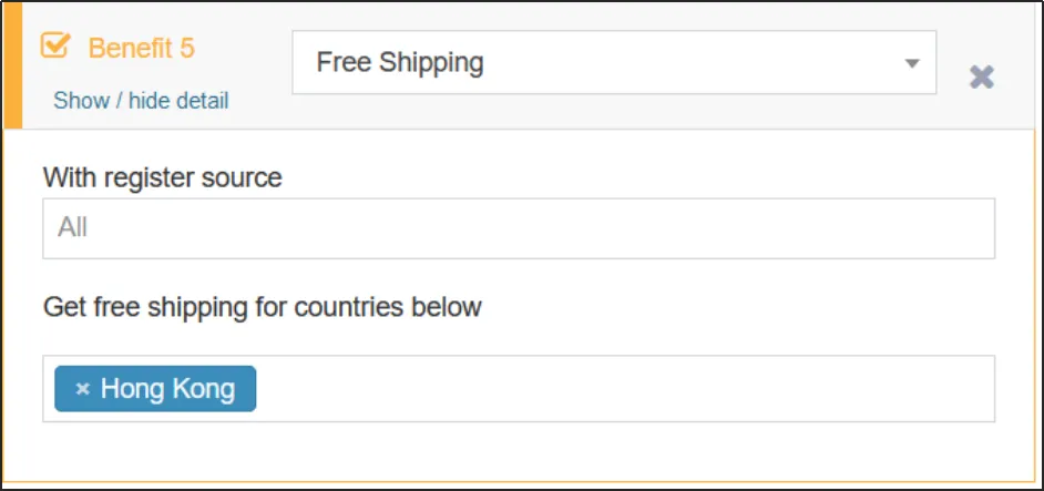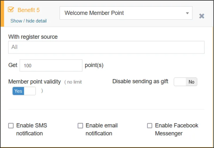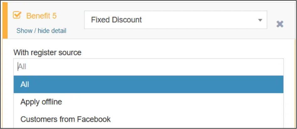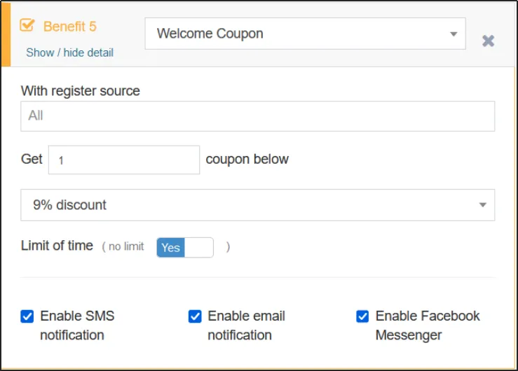 You can set that only customers with a certain enrollment source can receive the benefit, and the enrollment source here is a custom enrollment source that needs to be preset before it can be used. For the default method, see Playbook - Customer Settings.