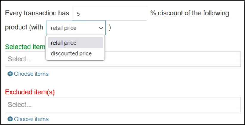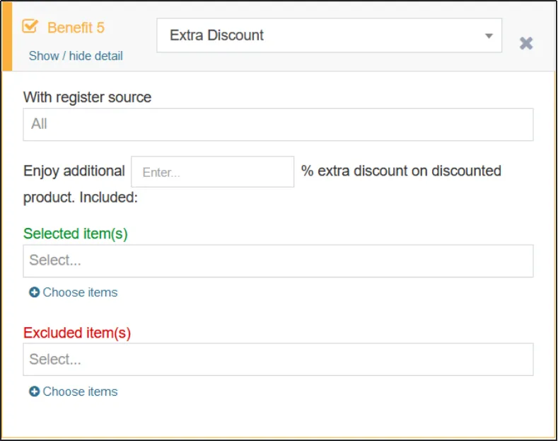 Enter the percentage of the additional discount for the sale items, and delineate the range of products that offer the additional discount by [Select items] and [Excluded items].
