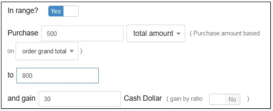Within a range: When enabled, the acquisition condition (purchase amount / number of items) changes from a fixed value to a range, and [prorated] cannot be used.