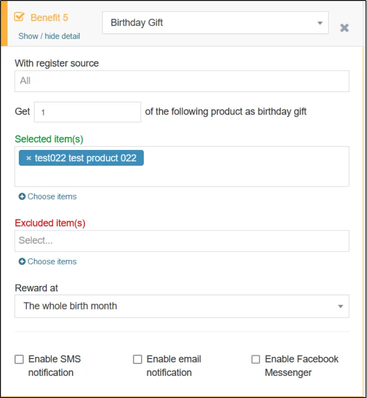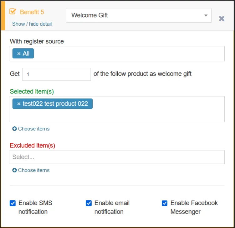 Welcome Gift: When a customer first becomes a member of this tier, they can get a free welcome gift. Select the number of gifts to be given and the number of gifts to give, and check Set notification method.