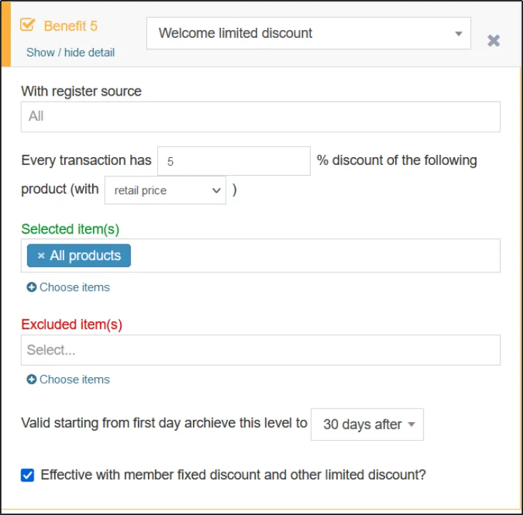 Set the percentage discount that can be enjoyed for each purchase, and choose whether the discount is calculated based on the retail price or the discounted price. The retail price refers to the original list price of the product, while the discounted price refers to the price of the product after other discounts. Similarly, the scope of products for benefit discounts is defined by [Picks] and [Exclusions].