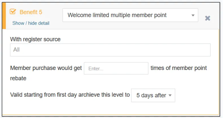 Welcome Time Double Points/Double Credit: Enter the bonus earning multiplier and set the validity period of the offer, the shortest is one day after becoming a member of the tier, and the maximum is 90 days.