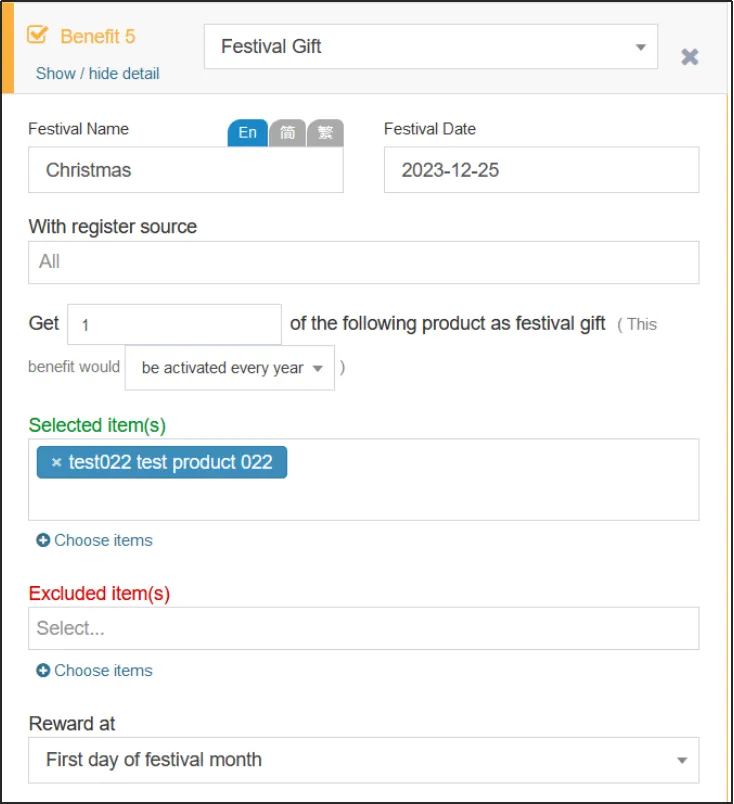 If it is an annual festival, you can choose to take effect every year, and the other parts are set up in the same way as the welcome related benefits.
