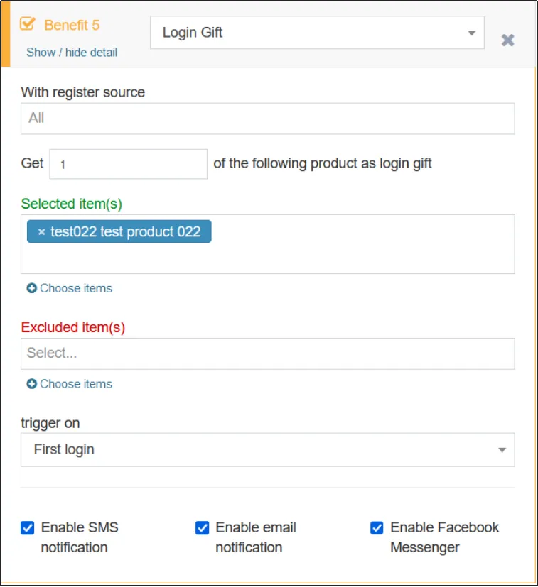 The login benefit needs to be triggered by setting the trigger time, you can choose to trigger the first login, or trigger it every n days (n is 1-30), and the other parts are set up in the same way as the welcome related benefits.