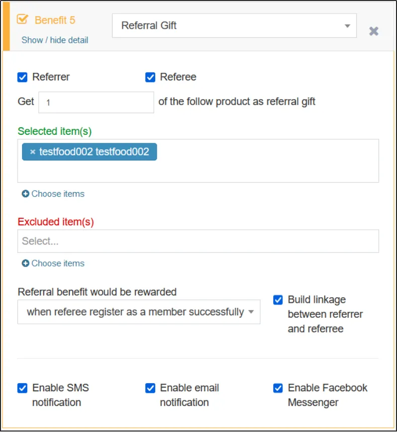When setting up referral benefits, you can select the referrer and the referee, and only those who check it can get the referral benefits. In addition, you need to set the effective time of the referral offer, and you can choose whether the referee successfully registers as a member, the referee completes the payment order for the first time, or the referee completes the payment order each time. The other sections are set up in the same way as the orientation-related benefits.