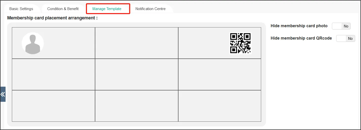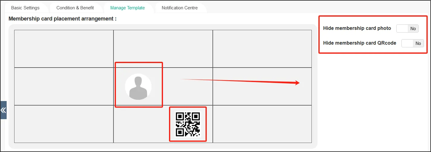 The grey avatar on the left represents the photo on the membership card, while the QR code on the right represents the membership card. Hold down and drag to change the position of the photo and membership card QR code. Enable [Hide Card Photo] and [Hide Card QR Code] on the right to hide the photo or QR code.