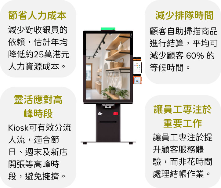 Kiosk可有效分流人流,適合節日、週末及新店開張等高峰時段,避免擁擠。