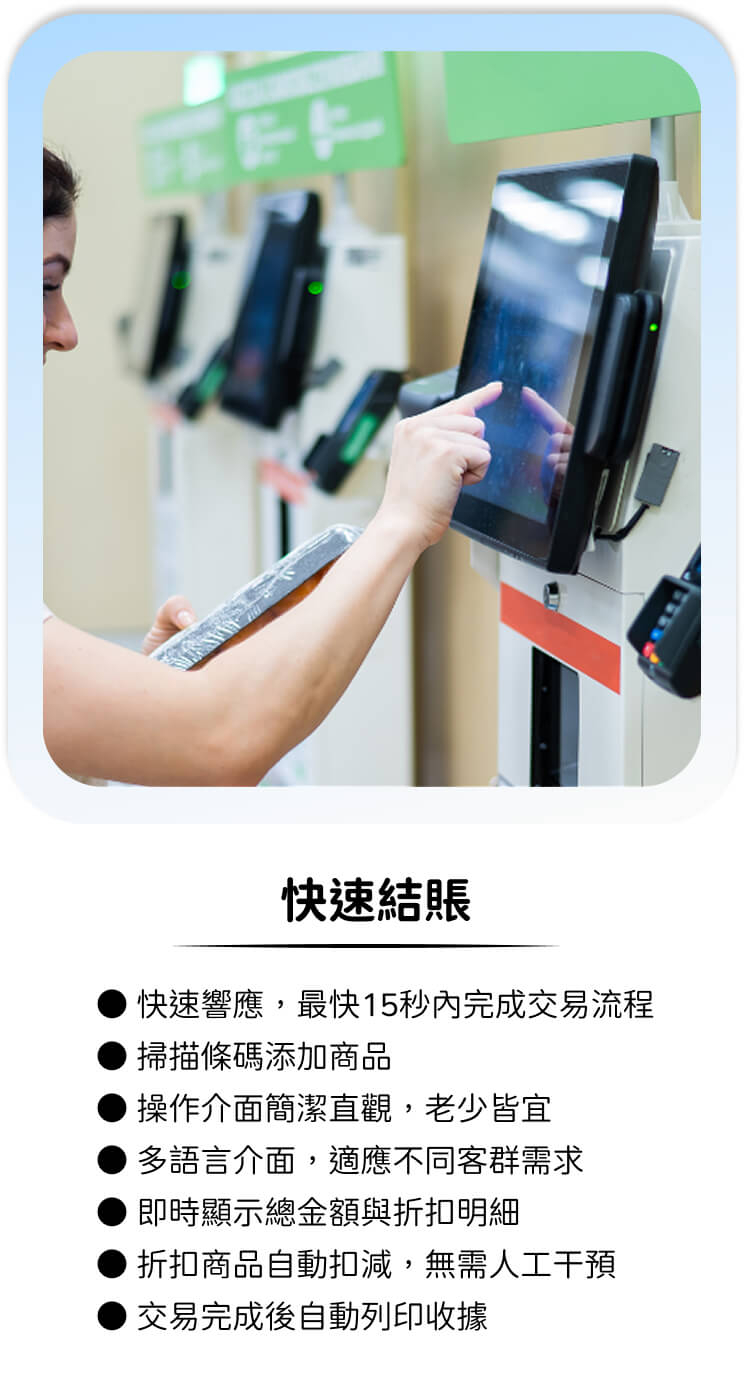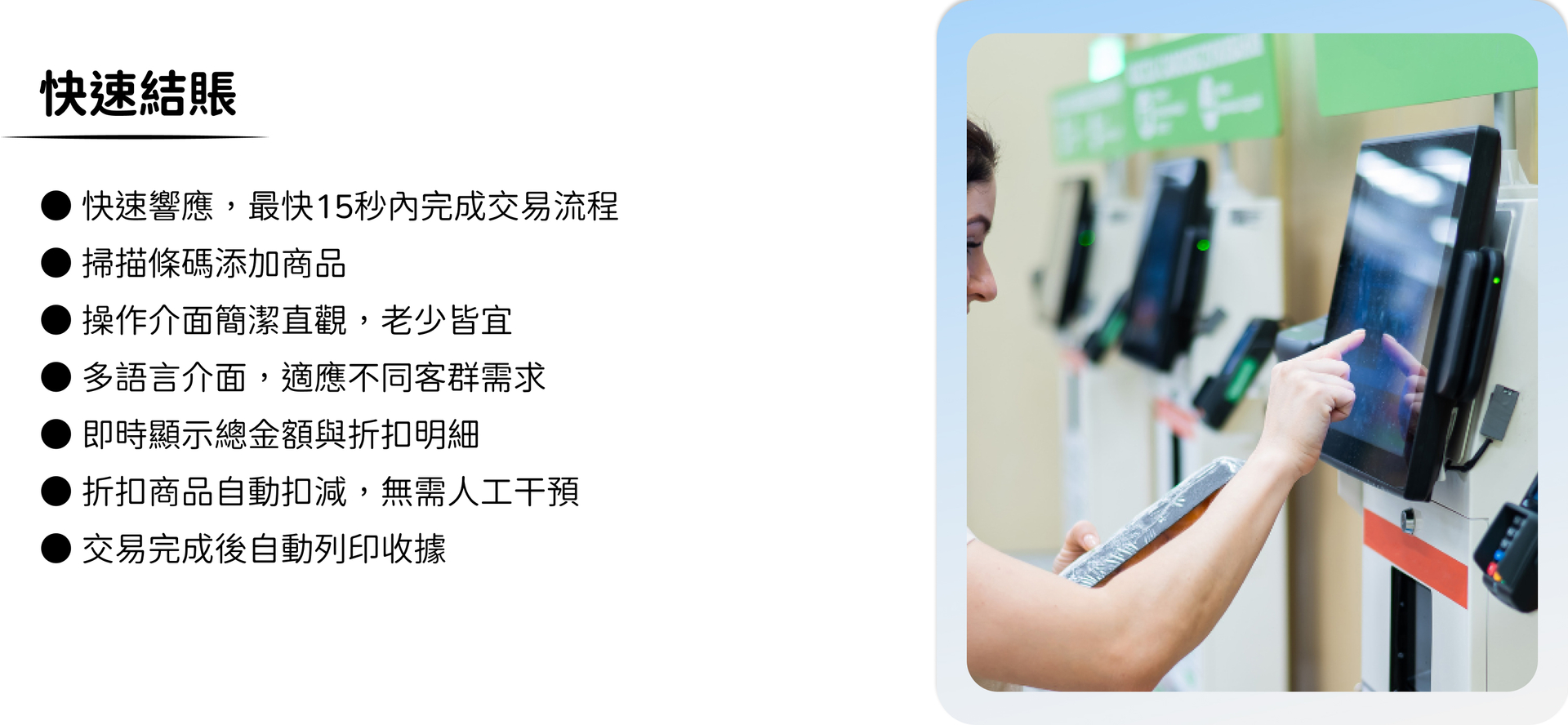 擺脫傳統繁瑣收銀流程,透過創新Kiosk系統與多元整合功能,打造迅捷、準確且人性化的結帳體驗,讓顧客與店家皆受惠。