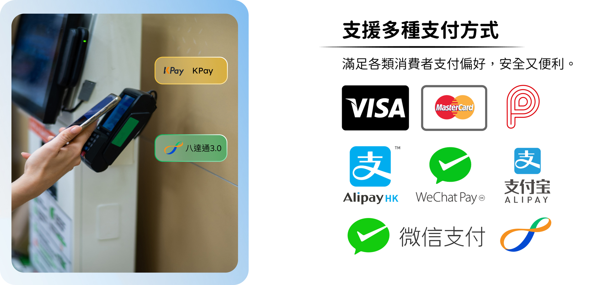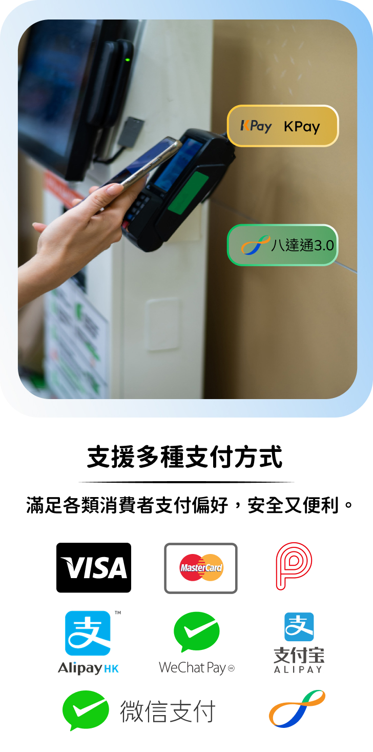 KPay 整合支付:Visa信用卡、Master信用卡、Pay Me、Alipay HK、WeChat Pay HK、支付寶、微信支付。