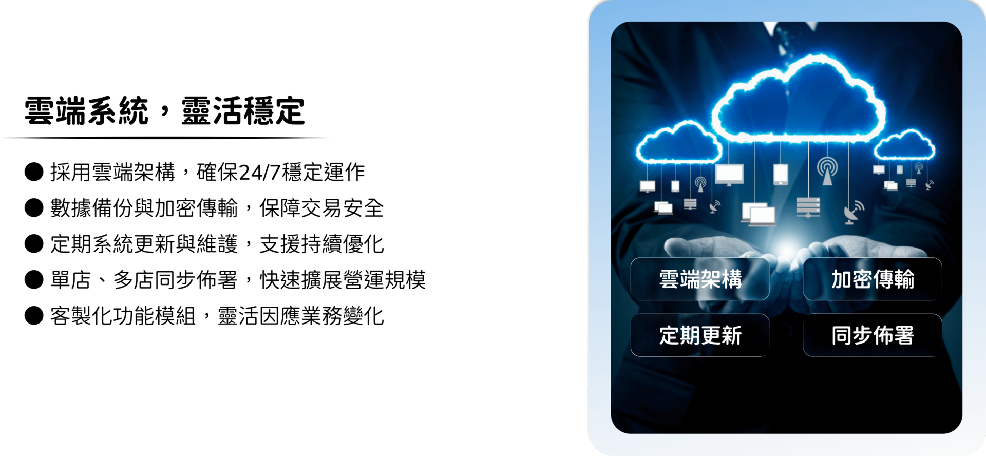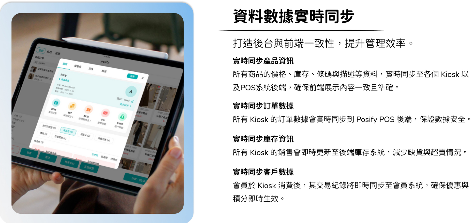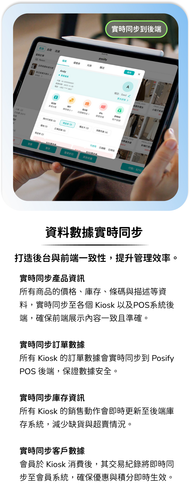 所有商品的價格、庫存、條碼與描述等資料,實時同步至各個 Kiosk 以及POS系統後端,確保前端展示內容一致且準確。