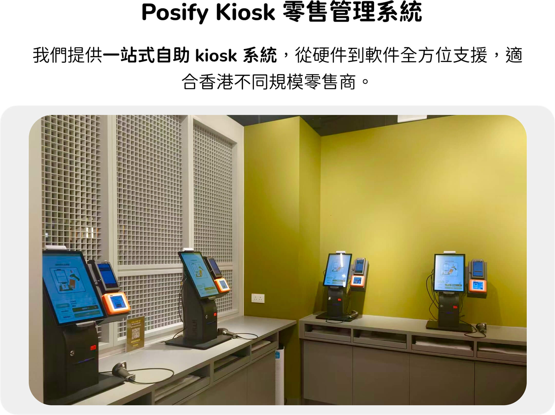 Posify Kiosk 自助結帳系統專為零售環境設計,幫助品牌提升結帳效率、減少人力成本、增加顧客滿意度。