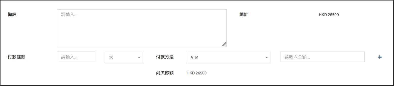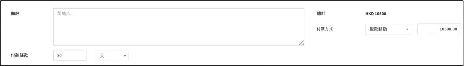 往下可以看到結算總計,可以設定付款條款和付款方法。