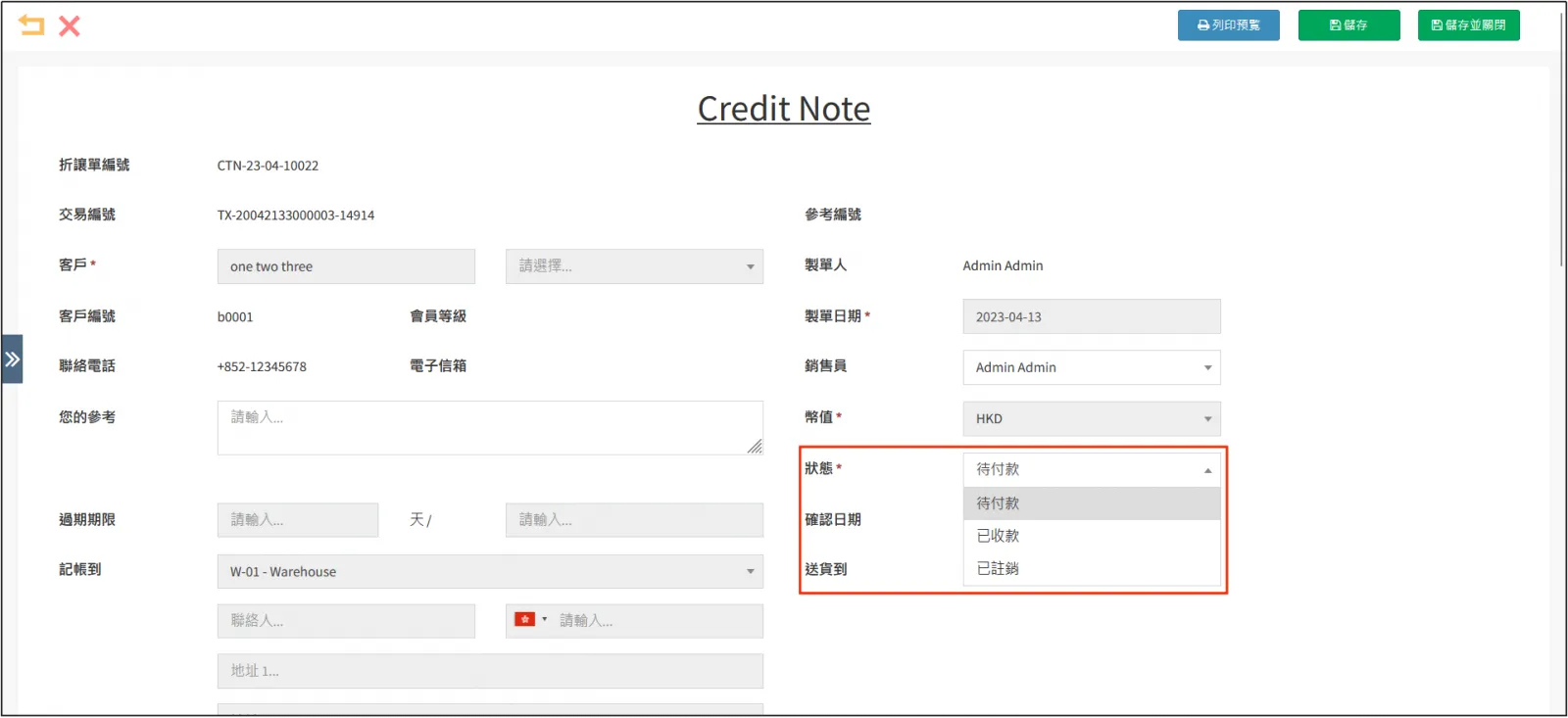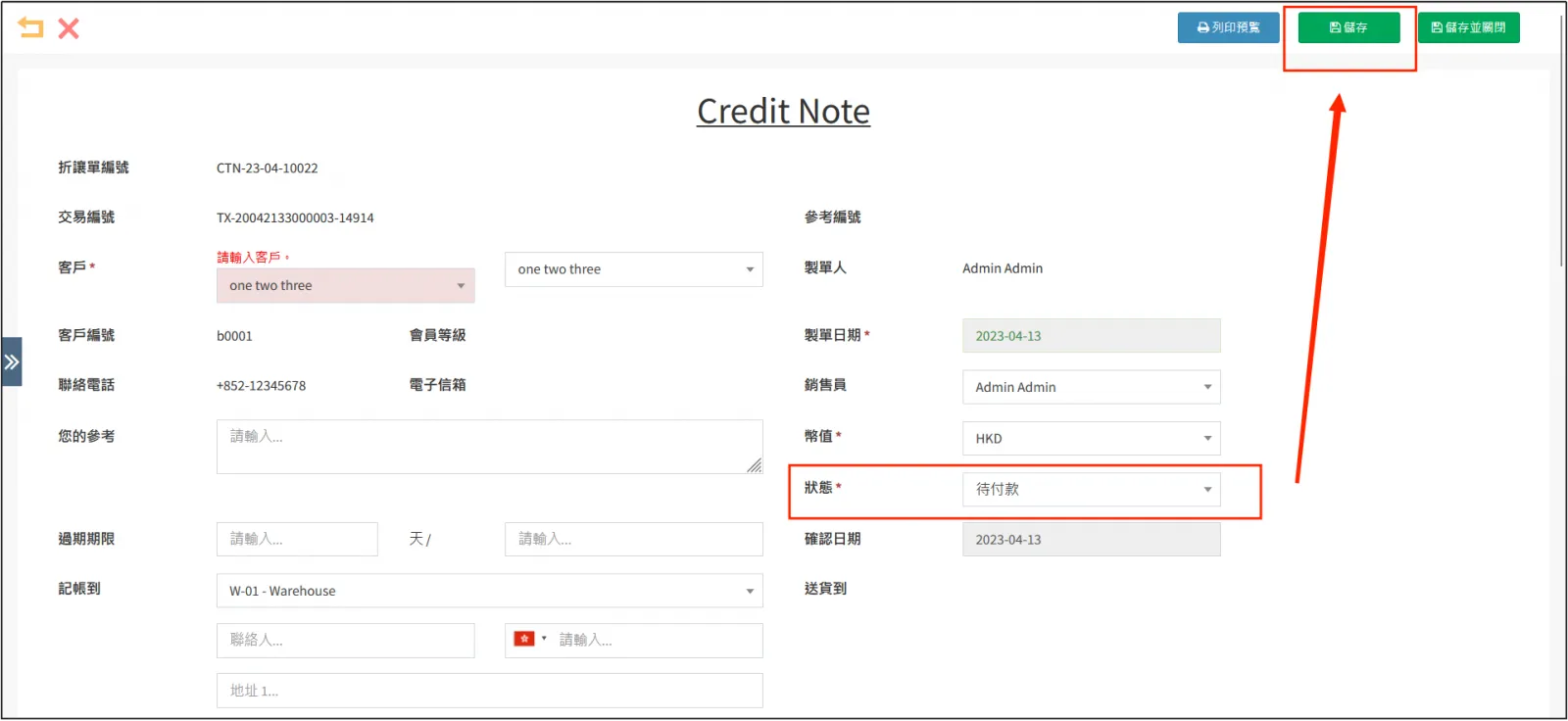 點擊右上角[儲存],即可創建Credit Note。
