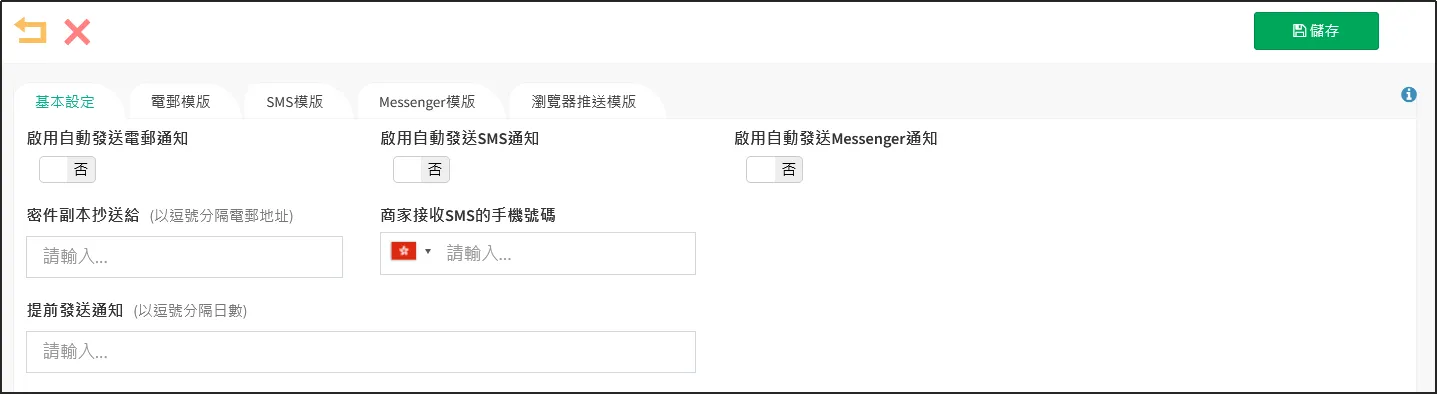 進入編輯頁面,打開頁簽 基本設定 。可以選擇 啓用自動發送電郵通知、自動發送SMS通知、自動發送Messenger通知 。如下圖設置,商家A將會以電郵方式進行通知。