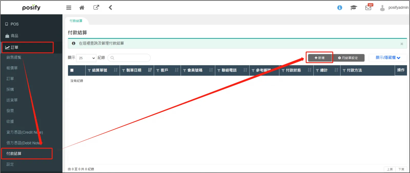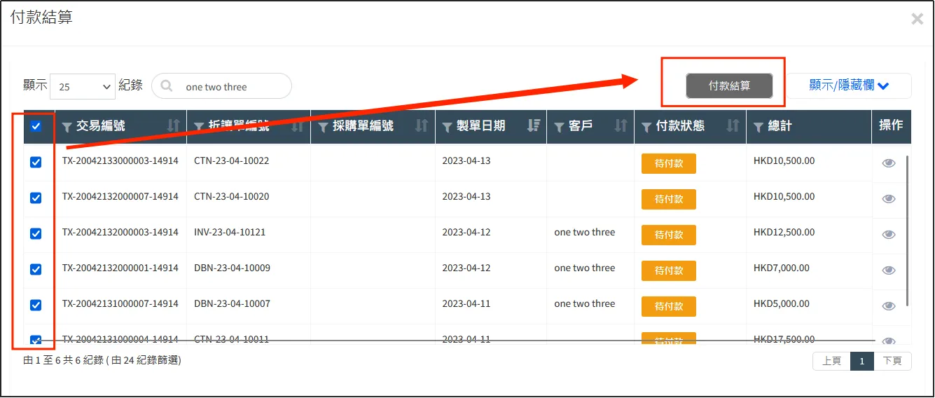 勾選想要結算的折讓單,即Debit Note和Credit Note,點擊右上方的[付款結算]。