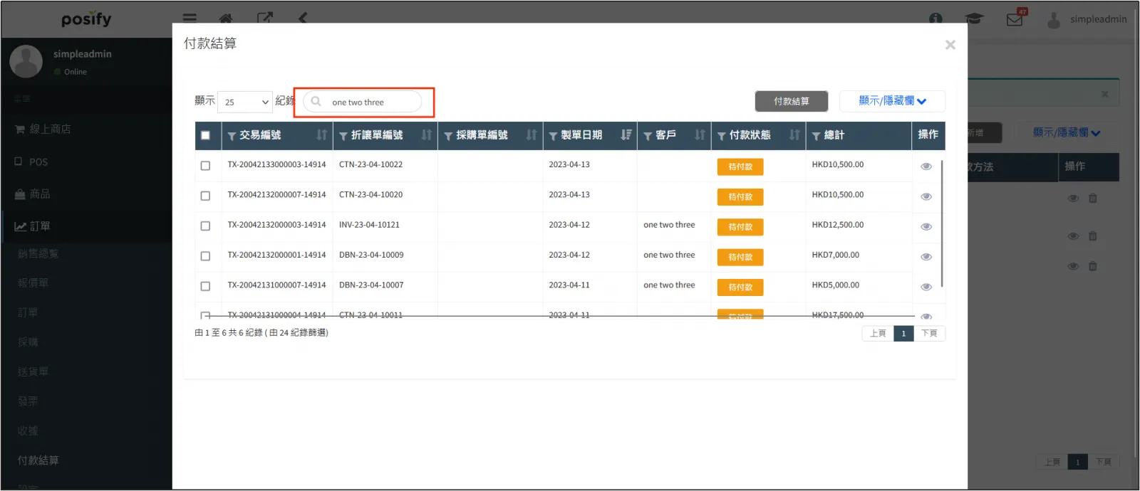 例如:搜尋客戶,輸入“one two three”,可以搜尋到所有和商家one two three的Debit Note和Credit Note。