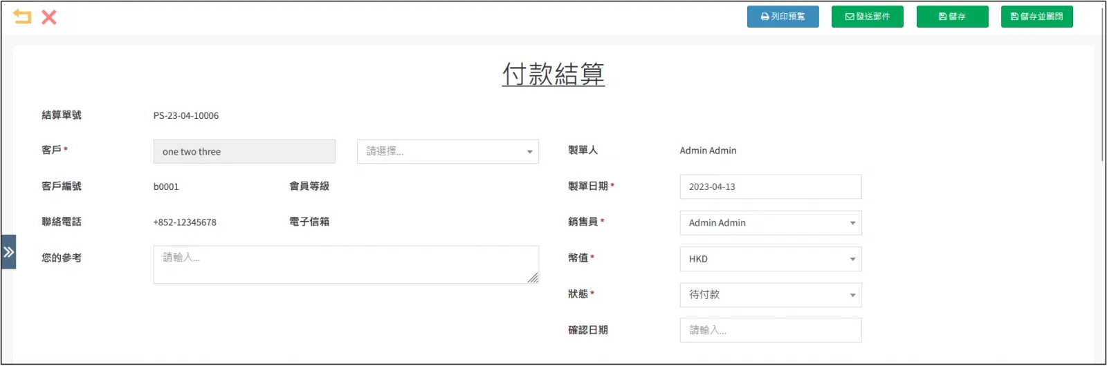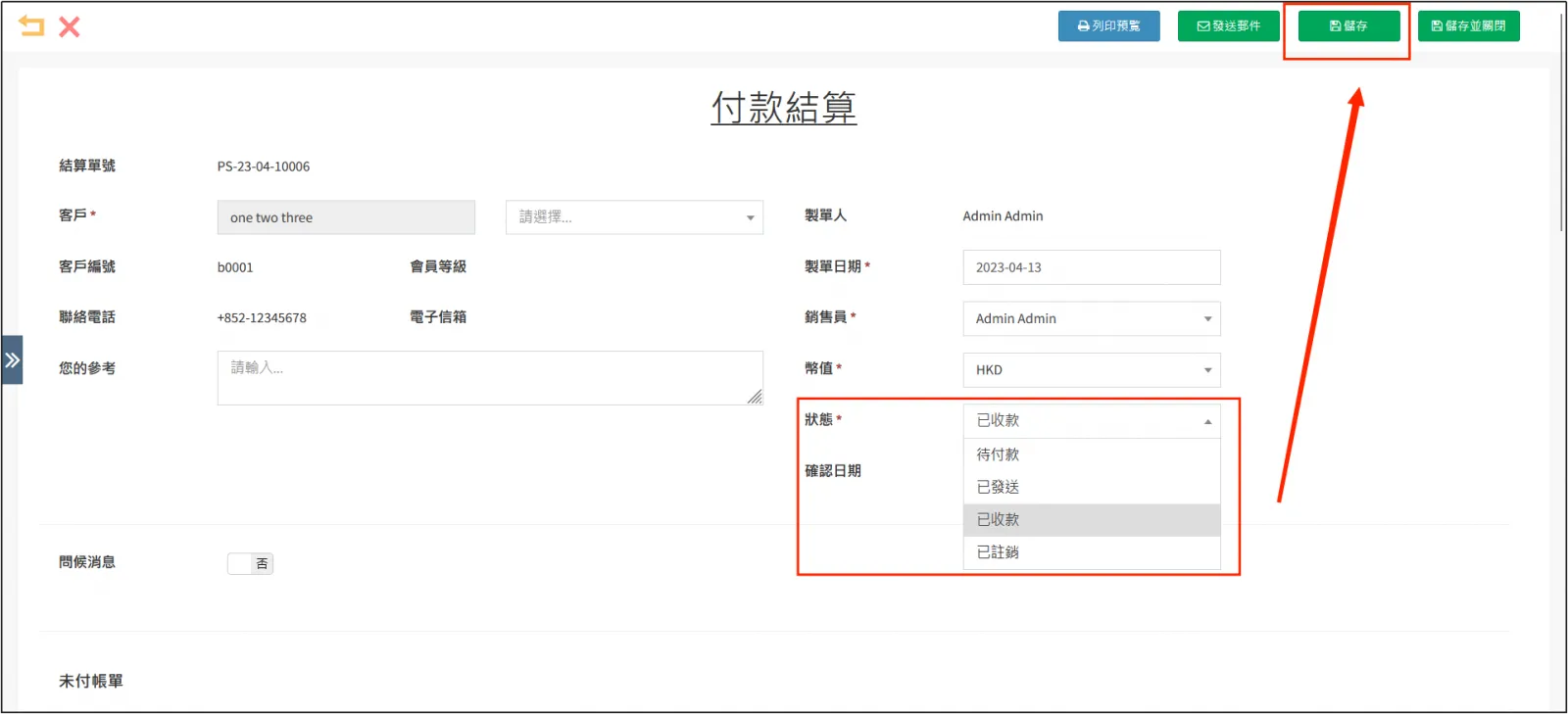 欠款的一方完成付款以後,將狀態修改為 已收款 ,再點擊右上角的[儲存],即可完成付款結算。