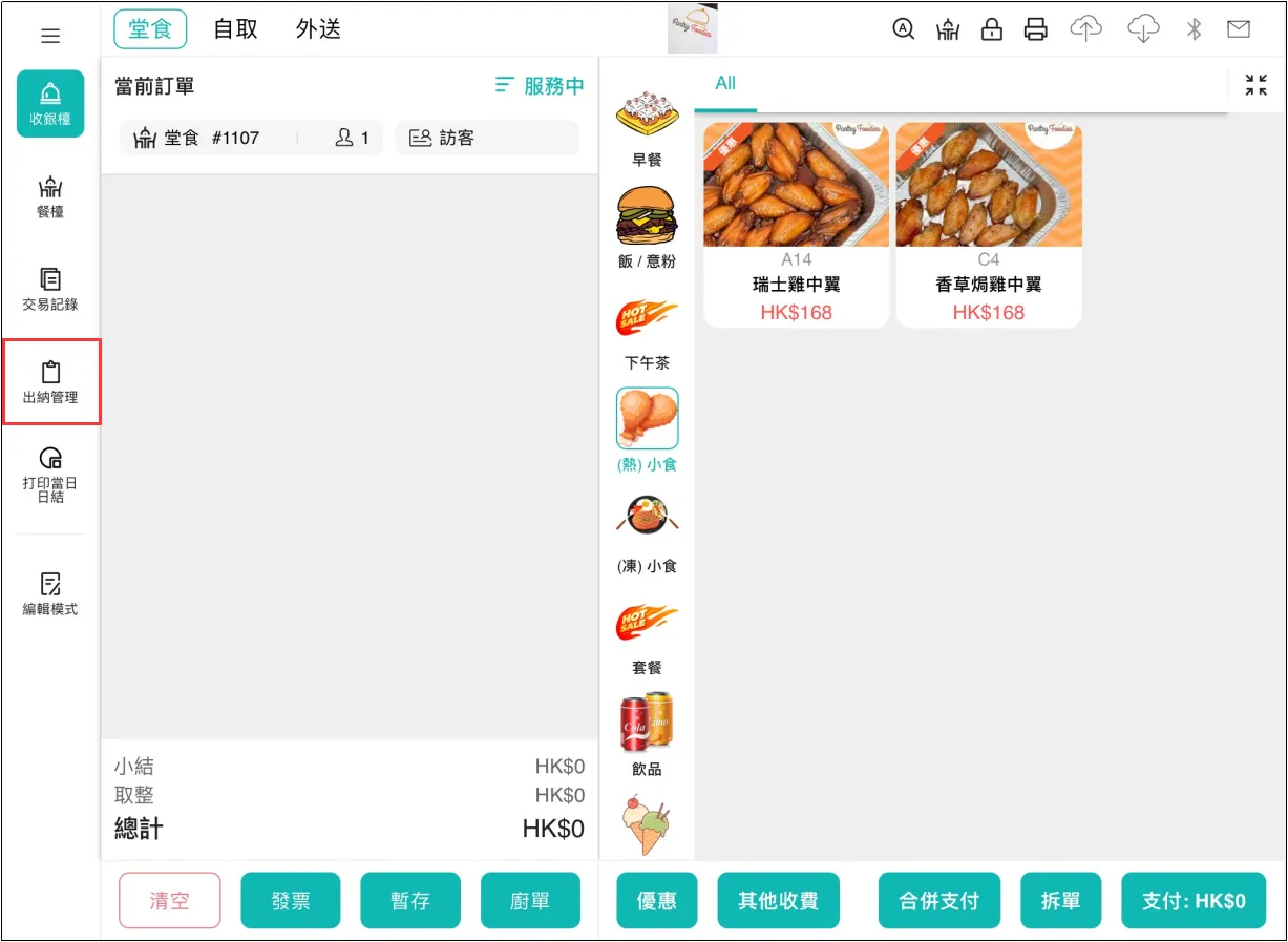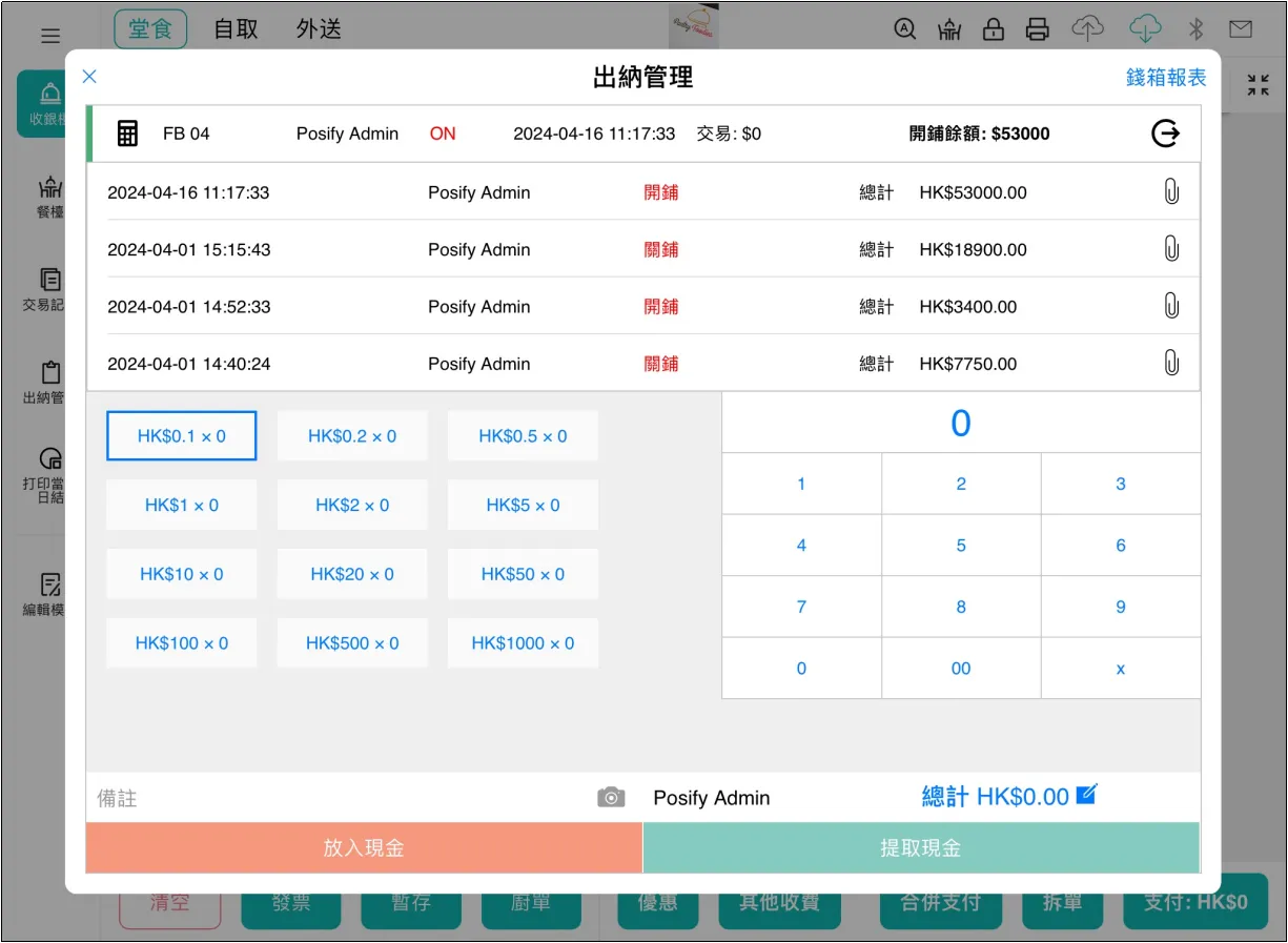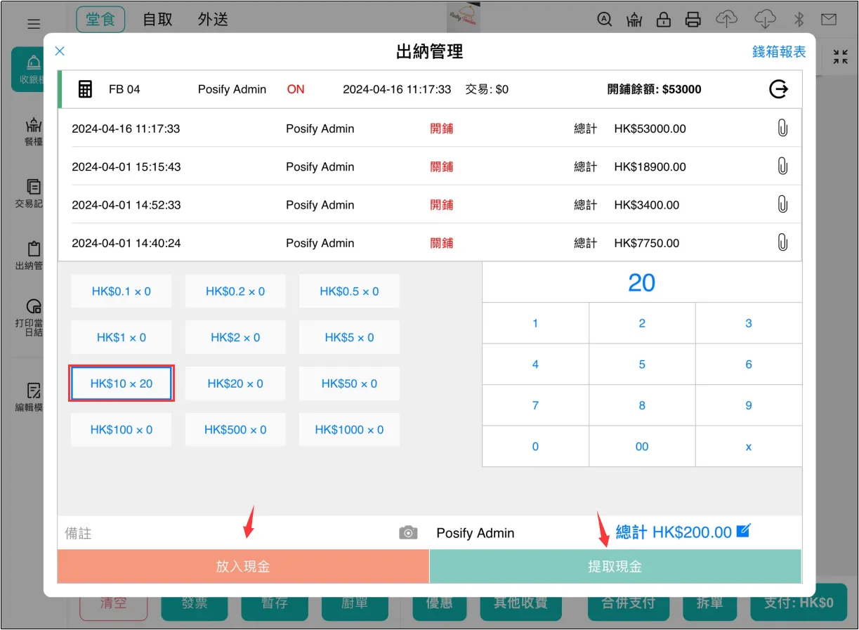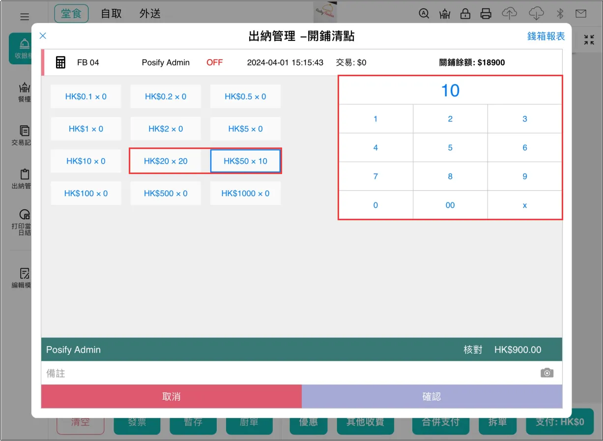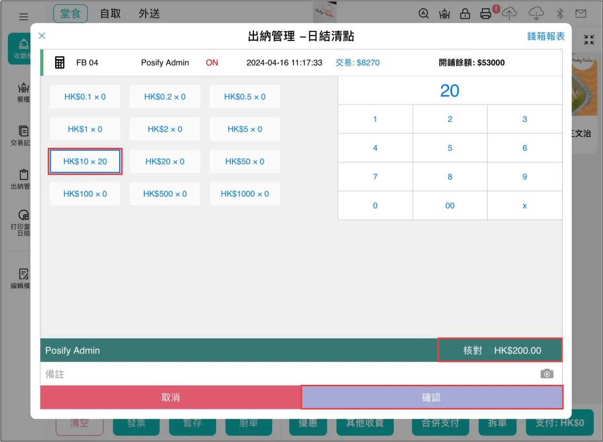 例如:收銀箱内有20張$20和10張$50,那就先點擊[$20 x 0],在右邊的數字鍵盤輸入“20”,再點擊[$50 x 0],在右邊的數字鍵盤輸入“10”,其他面額也請按照相同步驟操作,此時核對會更新金額。
