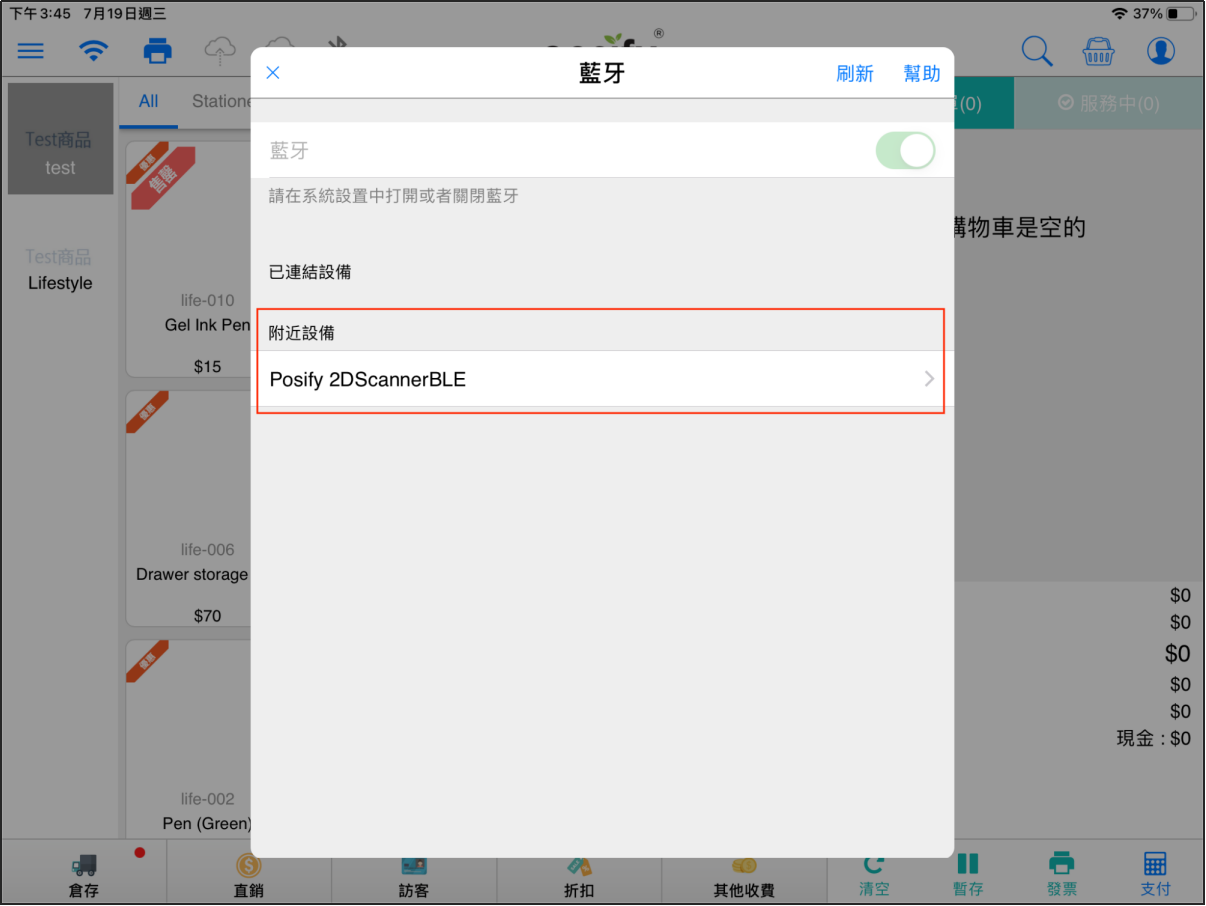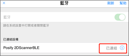 若無法連結,請確認平板電腦已打開藍牙,然後從附近設備列表中,選取Posify的藍牙條碼掃描器。如列表中沒找到Posify的藍牙條碼掃描器,請點擊右上角「幫助」,把掃描器切換為藍牙BLE模式,即掃描器掃描BLE模式的Qr Code。