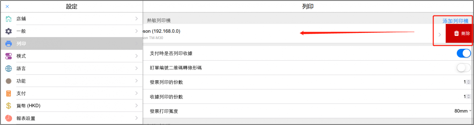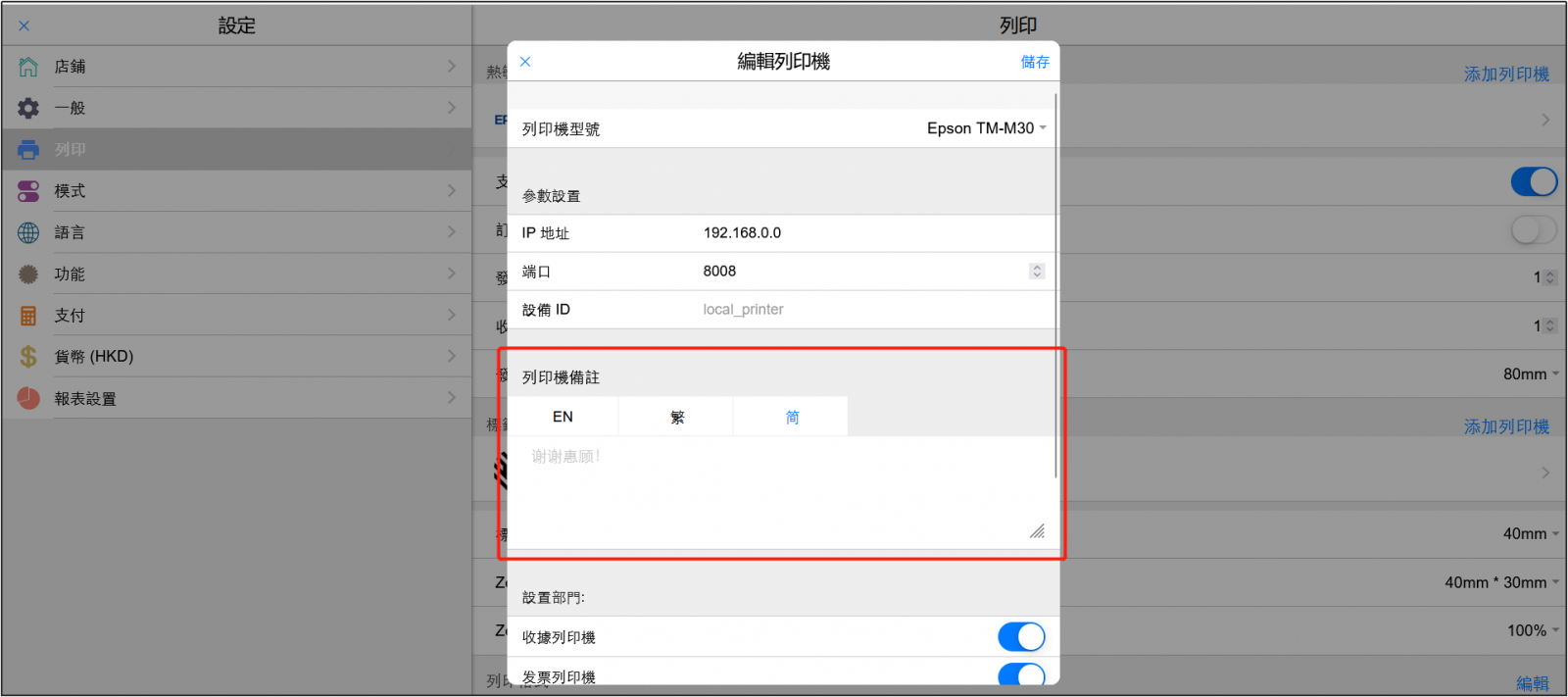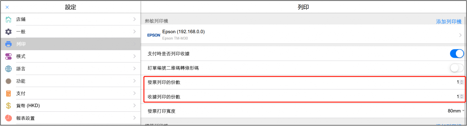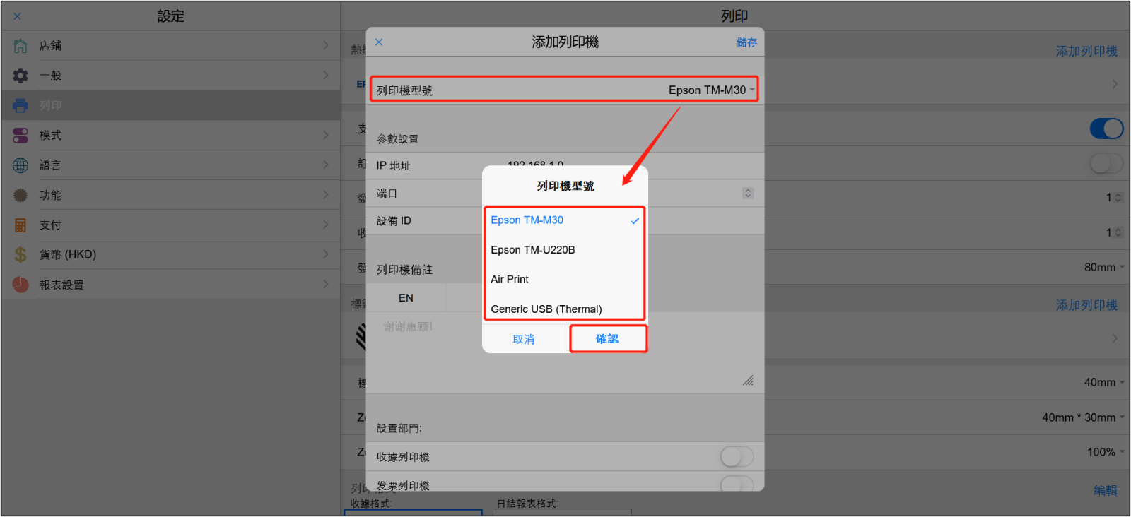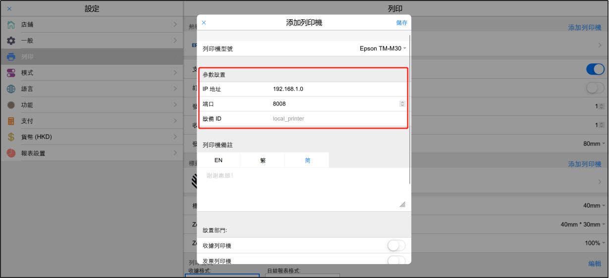 如果您使用的是EPSON TM-M30,那麼請參考這個視頻進行配置: https://www.youtube.com/watch?v=Wv0ksRk7Wew&feature=youtu.be