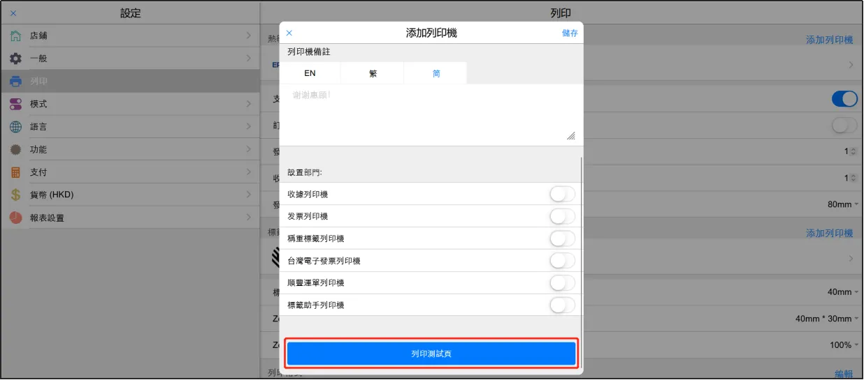 3) 點擊[列印測試頁]看是否有列印出測試單,如果成功出單,則可點擊[儲存]。如果沒有,請檢查列印機與iPad的連線是否正常,如有有成功連線,iPad會處於充電狀態。