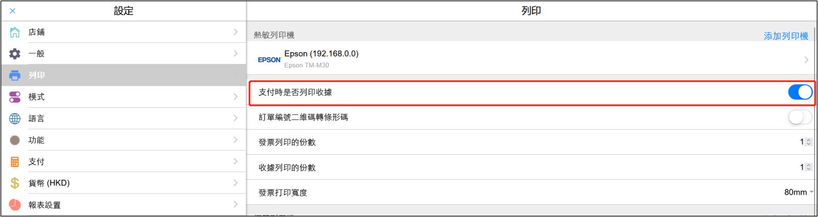 啟用[支付時是否列印收據]即可。