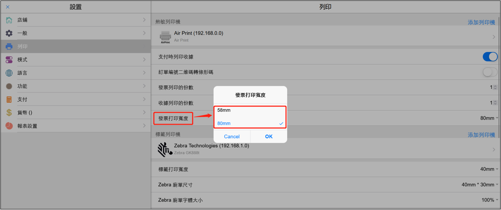 在[發票打印寬度]中選擇發票的寬度,可以選擇58mm或者80mm。
