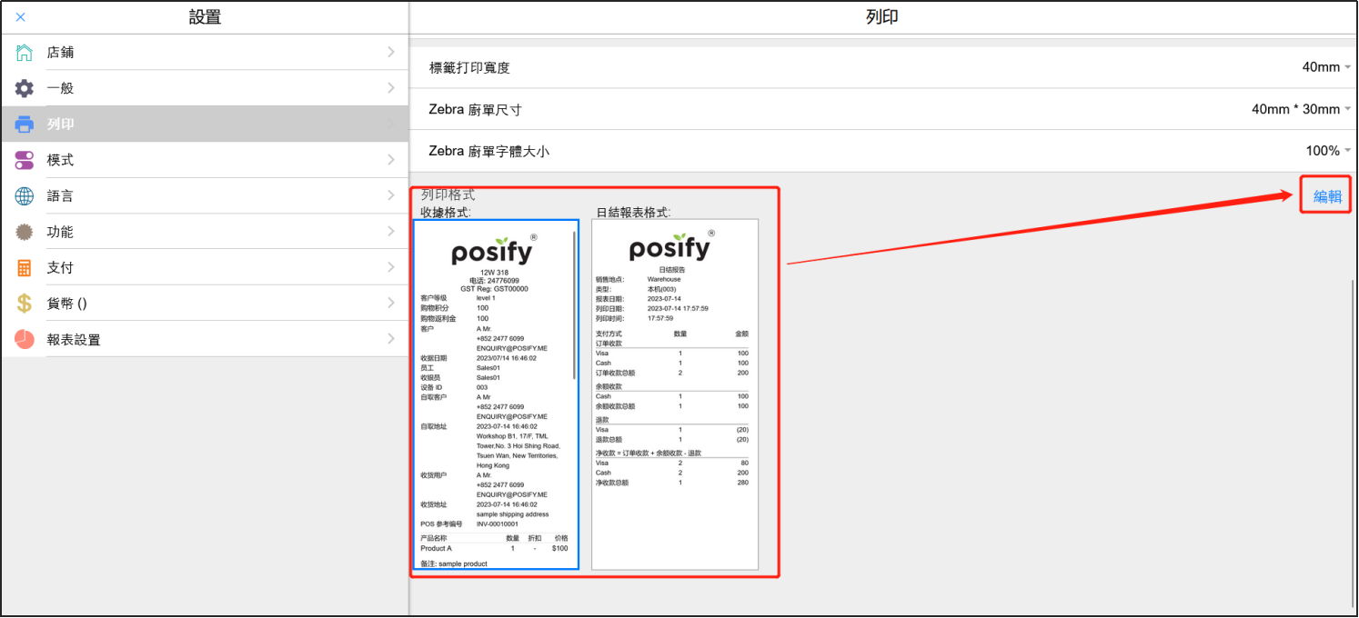 在[列印格式]下點擊選擇想要修改的列印格式,可以選擇收據格式或者日結報表格式
