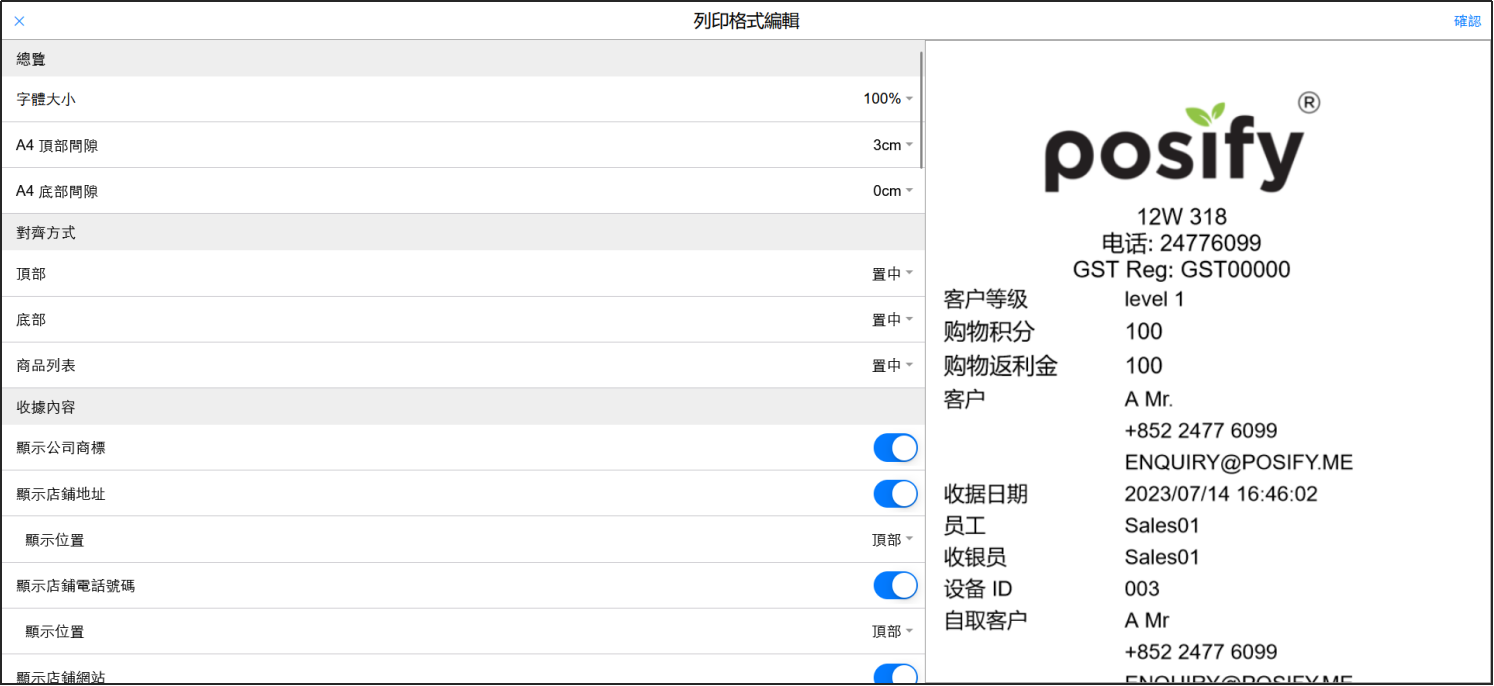 商家可以對列印格式中顯示什麽内容以及這些的内容的對齊方式進行設置。