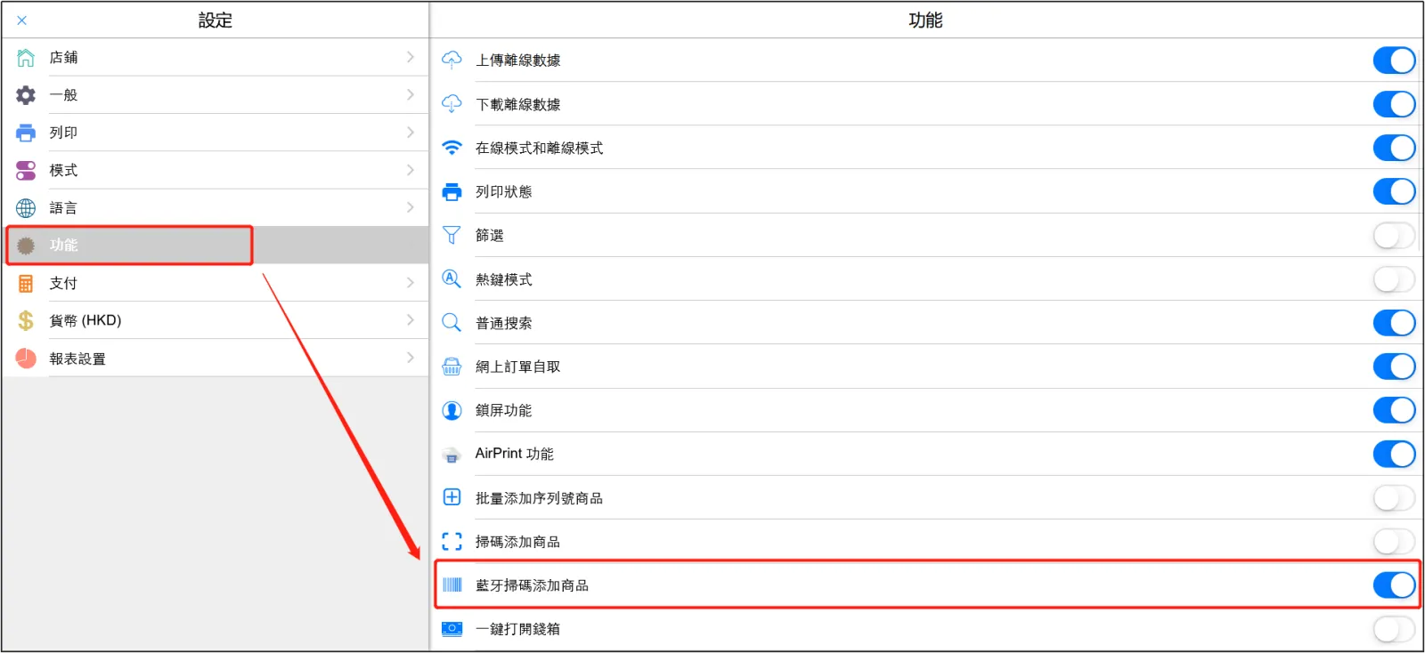 啓用[藍牙掃描添加商品]。