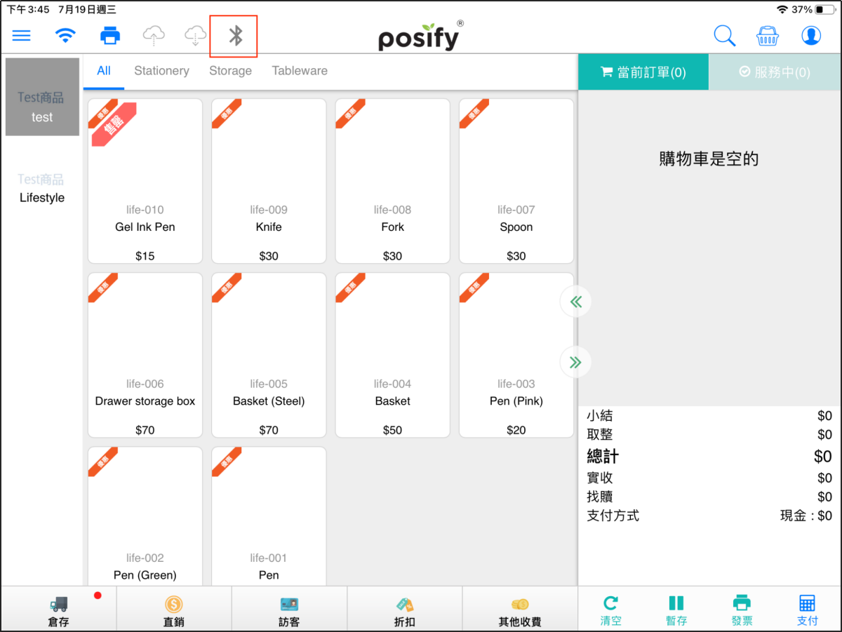 可以看到POS頂端有一個藍牙icon,未連接時顯示為灰色。點擊該藍牙icon。