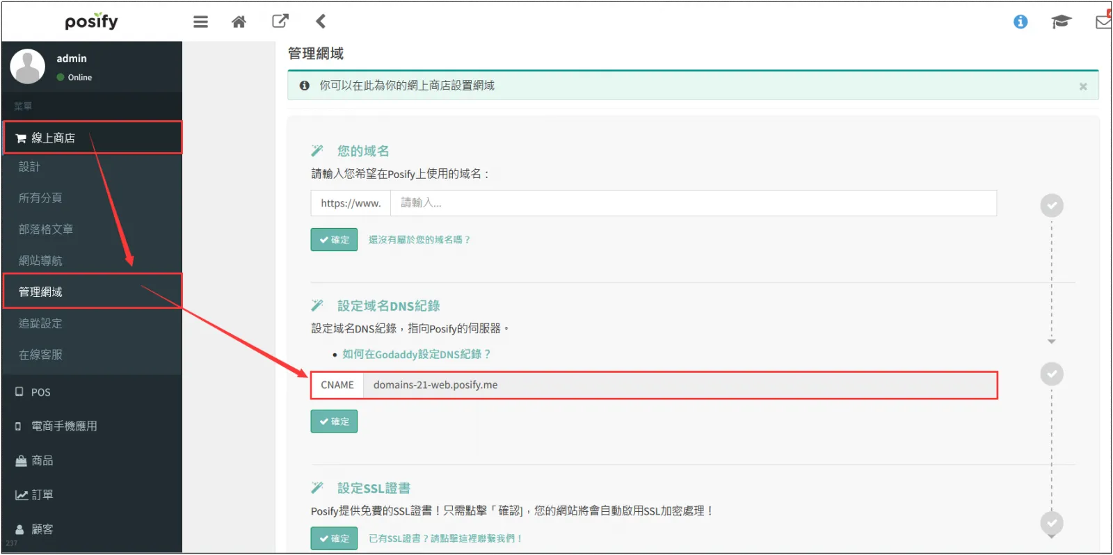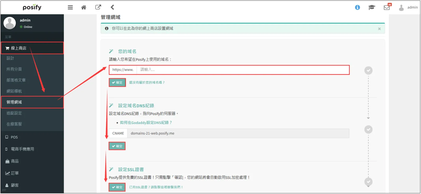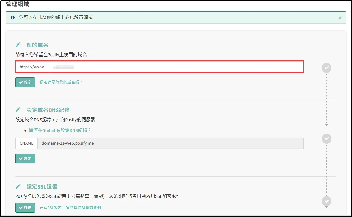 注意:請核實輸入的域名無誤再點擊[確認],確認以後輸入的域名無法修改。若確實輸入了錯誤的域名,請聯係Posify的工作人員。