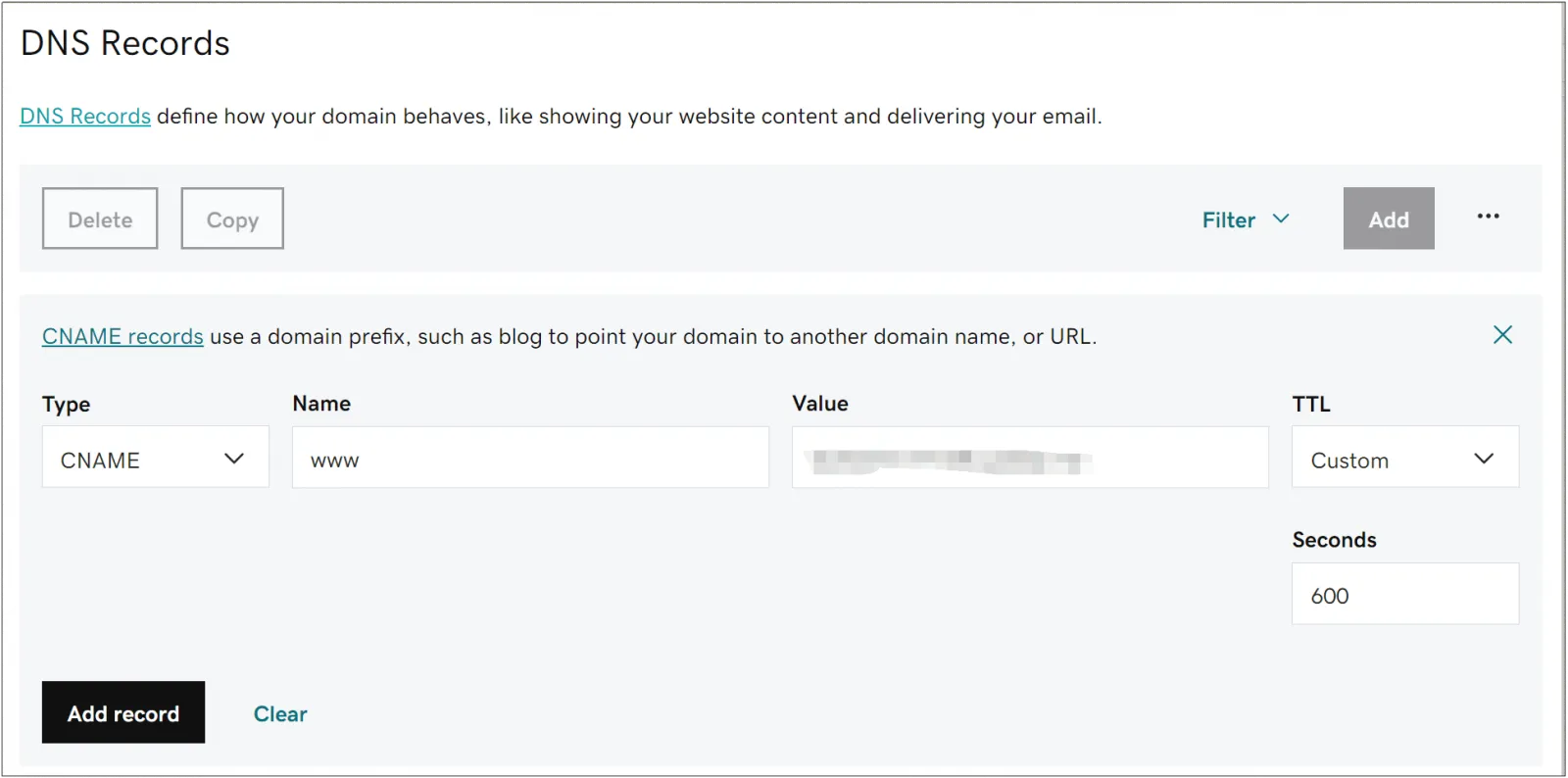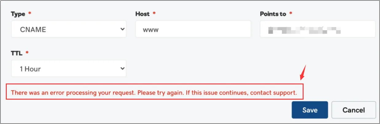 如果保存時,有看到如下錯誤畫面。說明當前已經存在重複的Type: CNAME,Host:www記錄,請找到該記錄,並直接將Points to修改為CMS當前CNMAE值即可,比如domains-21-web.posify.me。