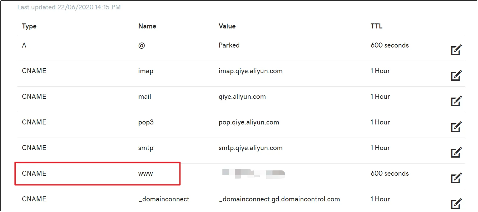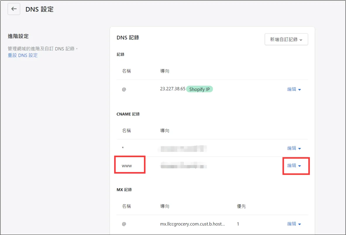 找到已經存在的CNAME記錄下的 WWW,如下圖所示: