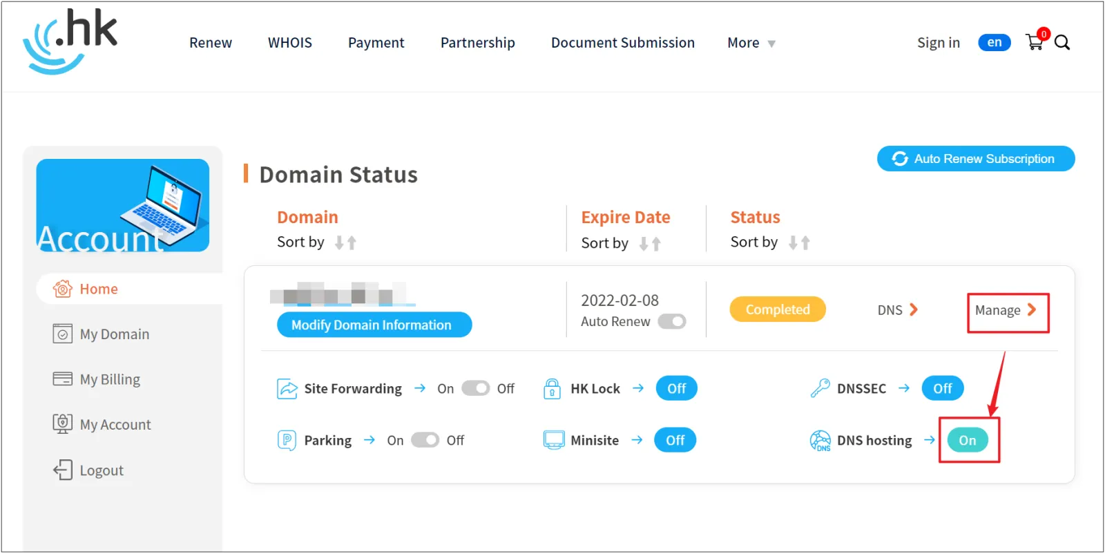 進入域名管理頁面,點擊Home->找到自己購買的域名,然後點擊 Manage > DNS hosting ON。