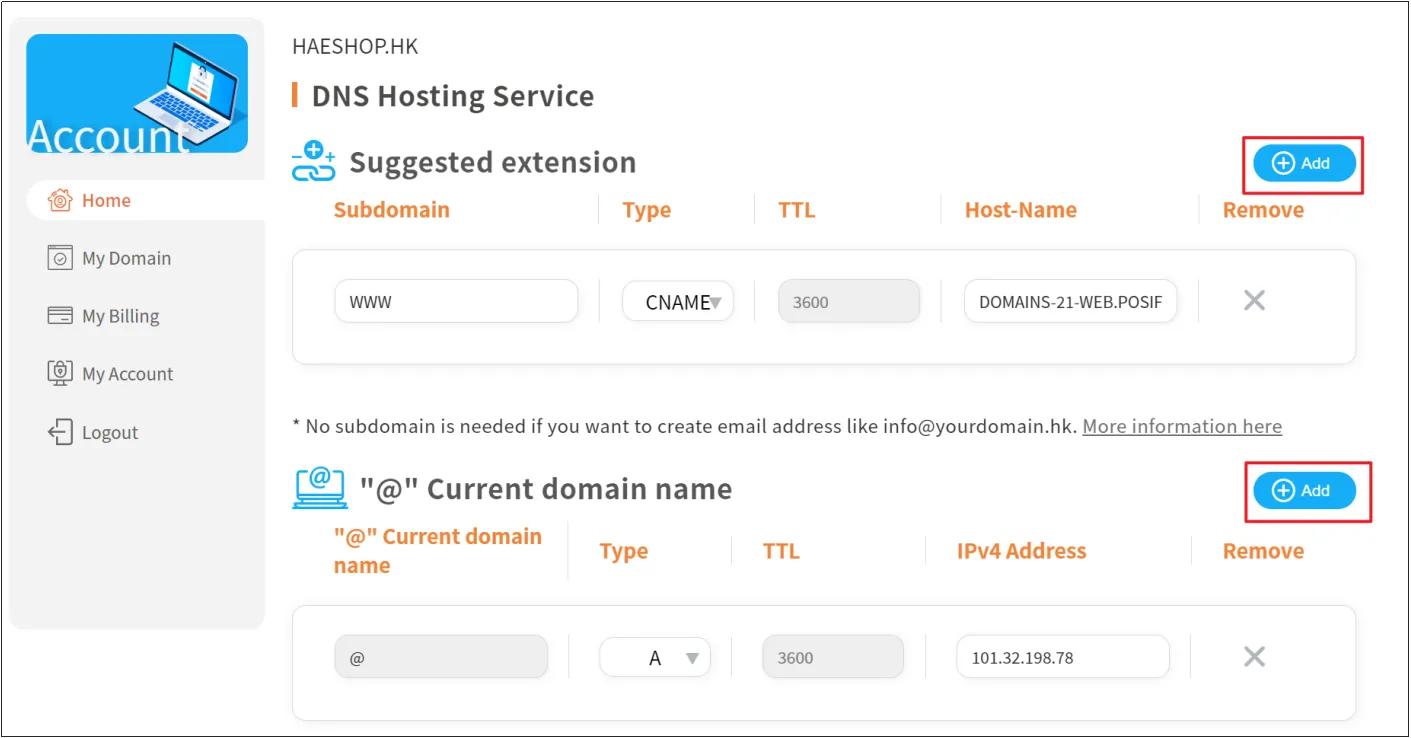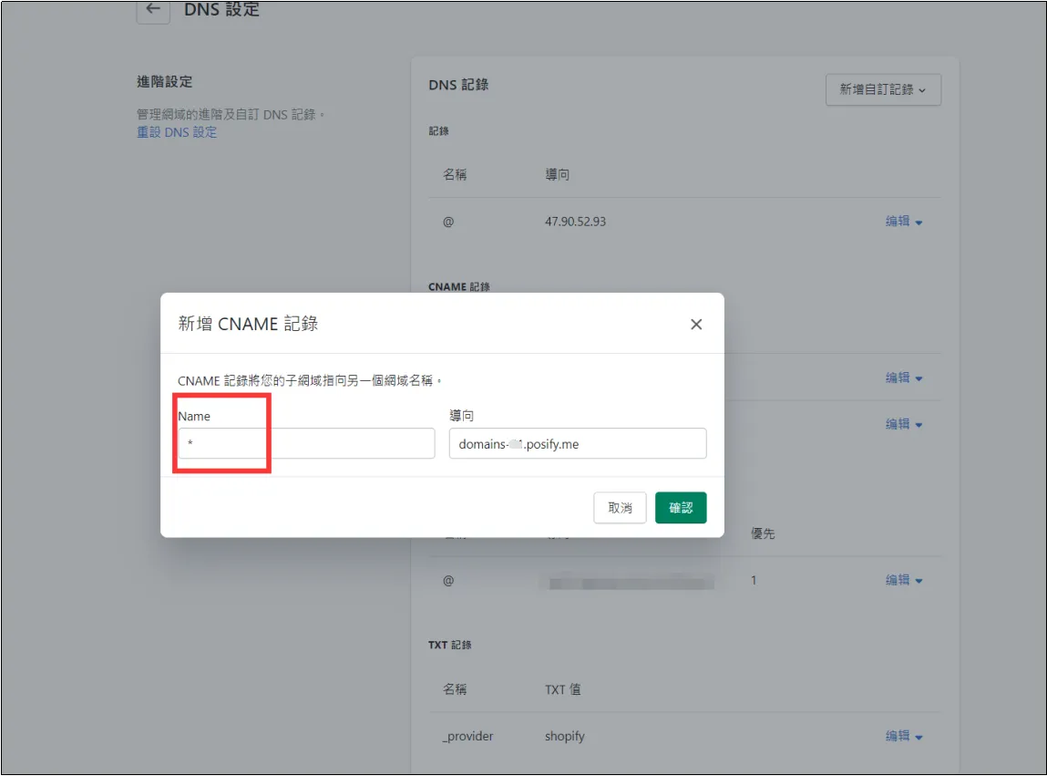 如果你希望訪問網站不需要輸入www,那麽請再新增一個CNAME 記錄,輸入*和CNAME值:domains-21-web.posify.me即可。