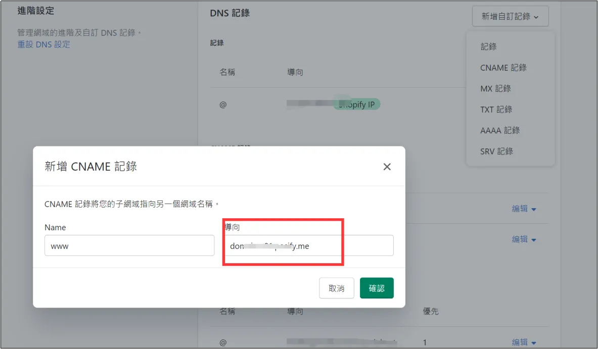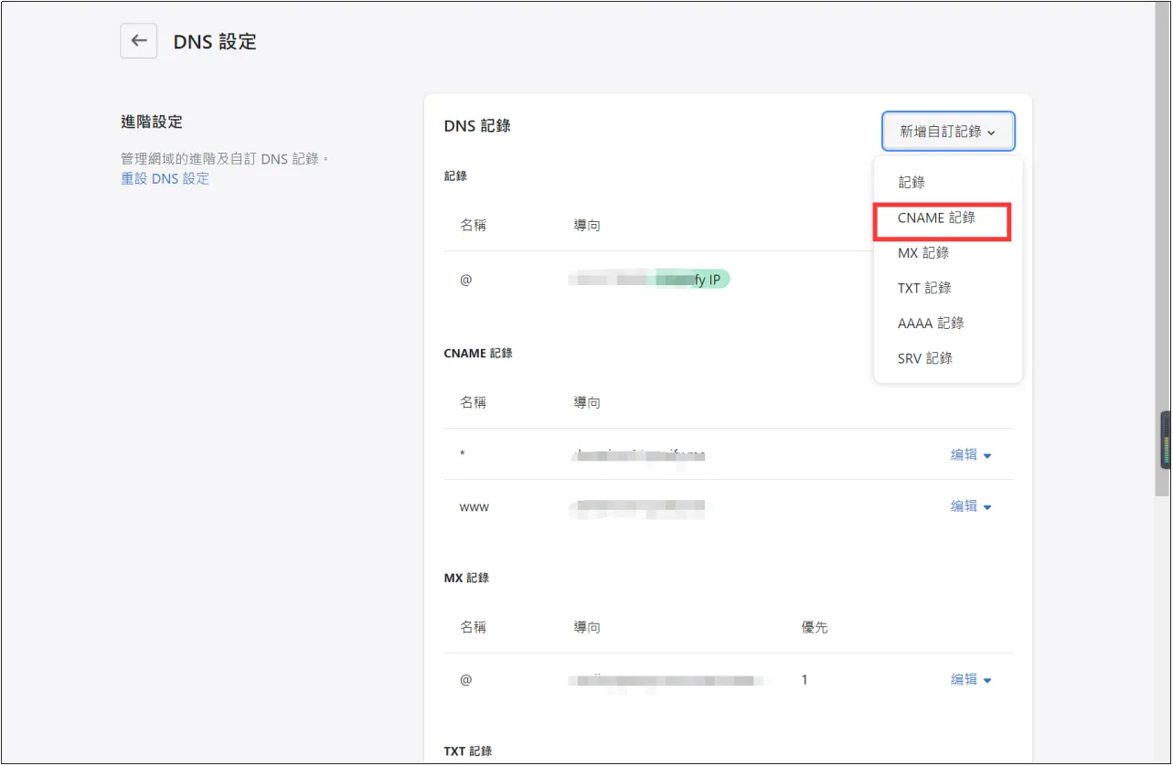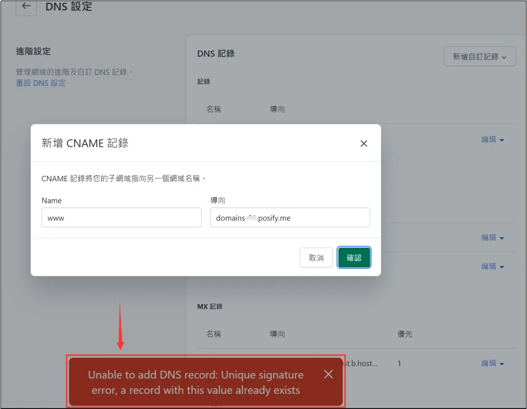 如果保存時,有看到如下錯誤畫面。說明當前已經存在重複的Type:CNAME, Host: www記錄,請找到該記錄,並直接修改導向為CMS當前CNMAE值,比如domains-21-web.posify.me即可。