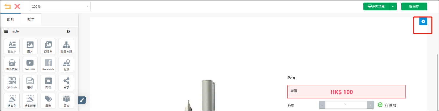 點擊[内嵌頁面]下的 產品詳情 右邊的小筆,打開頁面編輯頁面。